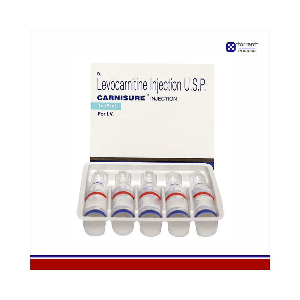 Carnisure Injection belongs to a class of medications called amino acids. It is used in the treatment of carnitine deficiency. It helps the body produce energy and improves the efficiency of body function. Carnisure Injection is generally administered by a healthcare professional. You should not self-administer this at home. It may cause injection site reactions like pain, swelling, redness that are generally mild and temporary.Carnisure Injection is usually a safe medicine, however, it may cause nausea, vomiting, diarrhea, abdominal pain, and reactions at the site of injection such as swelling, redness, and pain. Your doctor may monitor your blood glucose levels regularly while you are taking the medicine.Before starting the medicine, inform your doctor if you have any other medical conditions or are taking any other medications. Patients with severe kidney disease should not take this medicine unless prescribed by the doctor.