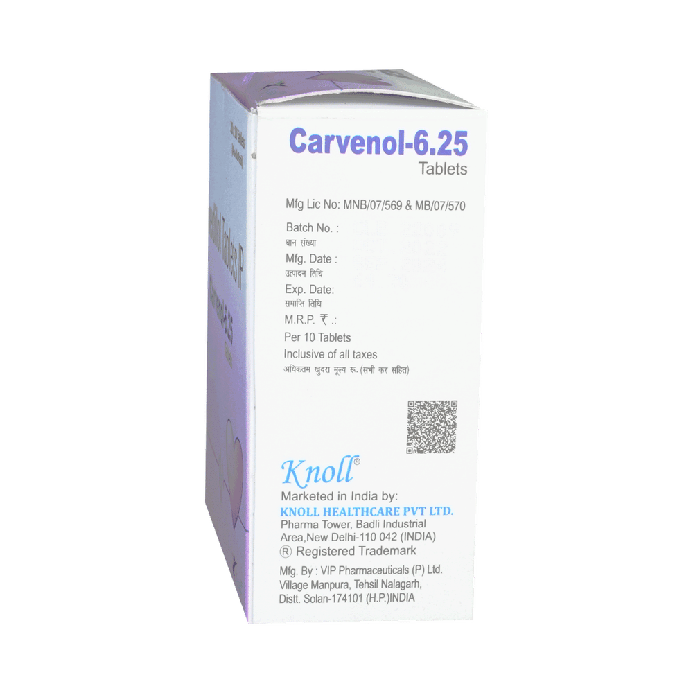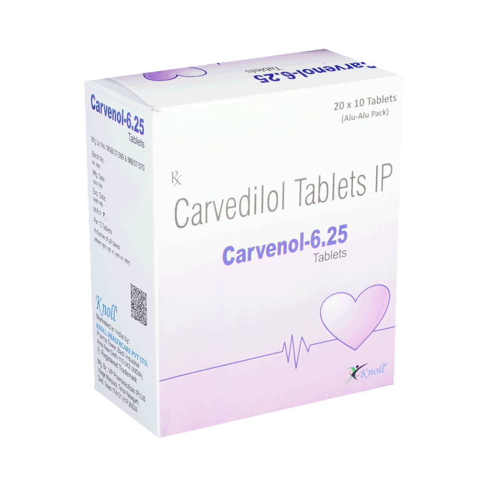 Carvenol 6.25mg Tablet is a medicine used to treat high blood pressure, heart-related chest pain (angina), and heart failure. It works by relaxing the blood vessels, so that blood can flow more easily to the heart. Lowering blood pressure also helps prevent future heart attacks and strokes. Carvenol 6.25mg Tablet should be taken with food. You should take it in the dose and duration as advised by the doctor. It is important to take it even if you feel well or your blood pressure is controlled. Do not stop this medicine without talking to the doctor, as your condition could get worse.Making some changes in your lifestyle will help improve your condition. These may include regular exercise, losing weight, smoking cessation, reducing alcohol intake, and reducing the amount of salt in your diet as advised by your doctor.This medicine is tolerated well by most patients, but it may have a few side effects. These include dizziness, headache, breathlessness, and tiredness. Let your doctor know if these side effects bother you or do not go away.Before taking this medicine, let your doctor know if you have any heart or kidney diseases. Pregnant or breastfeeding mothers should also consult their doctor before taking this medicine.