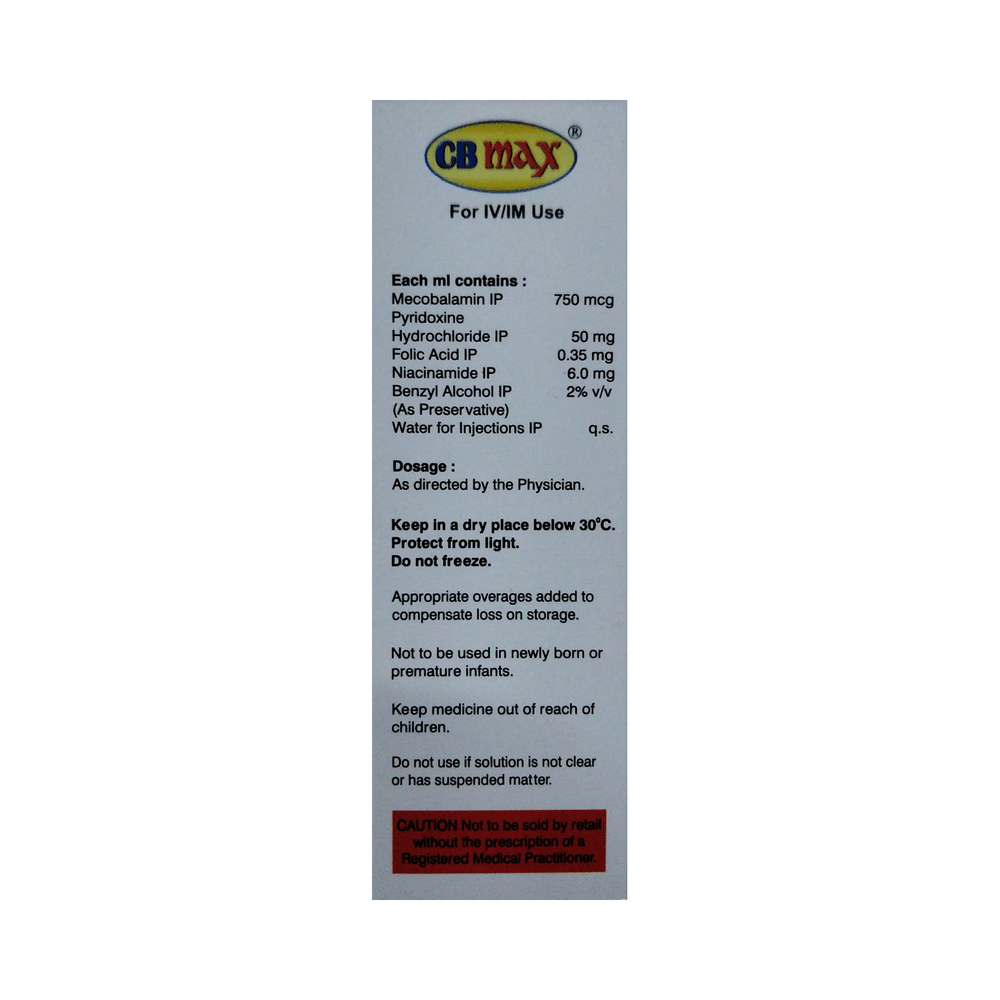 CB Max Injection is a combination medicine that is used to treat nutritional deficiencies that may arise due to poor diet, certain health conditions, or increased nutritional needs. It helps restore the body’s nutrient balance and improve energy levels, nerve health, and general well-being. CB Max Injection is usually administered by a doctor or a nurse through an intramuscular route. It is important to complete the recommended course for the best results. Regular follow-ups may be advised to monitor your progress and ensure your body is responding well to the treatment.There is limited data on the common side effects of CB Max Injection. Some people may experience mild side effects such as pain, redness, or swelling at the injection site. These are usually temporary and go away on their own. If you notice any unusual symptoms or signs of an allergic reaction, like rash, itching, or breathing difficulty, seek immediate medical help.Before starting CB Max Injection, let your doctor know if you have any allergies, medical conditions, or if you are taking other medications or supplements. Pregnant or breastfeeding women should use this injection only if prescribed by their doctors. Avoid self-medicating or using it without the proper diagnosis, as unnecessary or excessive use of vitamins can sometimes lead to unwanted side effects.