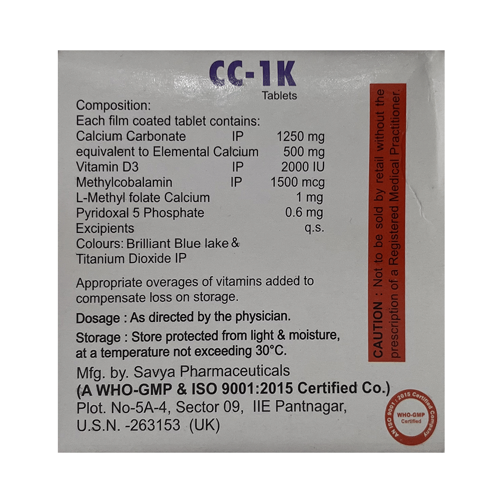 CC 1K Tablet is a combination of five medicines : Calcium Carbonate, Vitamin D3, Methylcobalamin, L-Methyl Folate Calcium, and Pyridoxal-5-phosphate. Calcium carbonate is a dietary supplement used when the amount of calcium taken in the diet is not enough. Vitamin D3 is a form of vitamin D. It raises vitamin D levels in your blood. This in turn raises calcium levels in your blood by helping you absorb more calcium from food. Methylcobalamin is a form of vitamin B12 that restores its level in the body thereby helping in treating certain anemias and nerve problems. L-Methyl Folate Calcium and Pyridoxal-5-phosphate are nutritional supplements that provide essential nutrients to our body and improve overall health.