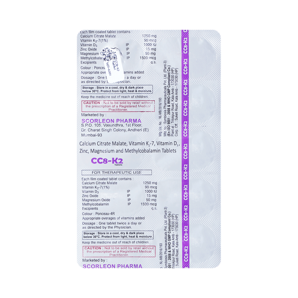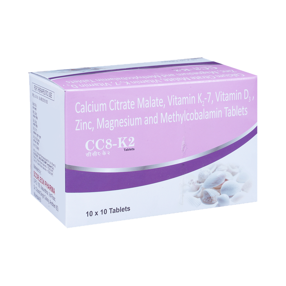 CC8-K2 Tablet is a combination of supplements used to treat nutritional deficiencies in the body. It enhances calcium absorption, supports bone health, and helps prevent conditions such as osteoporosis. It also supports nerve and muscle function and boosts immune health. Take CC8-K2 Tablet exactly as prescribed by your doctor. It is best taken with a meal to enhance absorption and reduce the chance of stomach upset. Take it regularly and take it at the same time each day, this will help maintain consistent levels in your body. In addition to taking the medicine, maintain a balanced diet and stay physically active for maximum benefits.There is limited data about the side effects of CC8-K2 Tablet. However, it may cause mild gastrointestinal issues such as bloating, gas, or constipation and headaches in some people. If you experience any of these side effects that persist or worsen, let your doctor know. To prevent these side effects, take the tablet with food and stay hydrated.Before taking the medicine, inform your doctor if you have any known allergies to the ingredients in the tablet. Let your doctor also know about any preexisting medical conditions, especially kidney problems, heart disease, or a history of kidney stones. The supplement may interact with other medications or supplements, so inform your doctor about all the medicines you are taking. Pregnant and breastfeeding women should consult their doctor before taking this medicine to make sure it is safe for them.