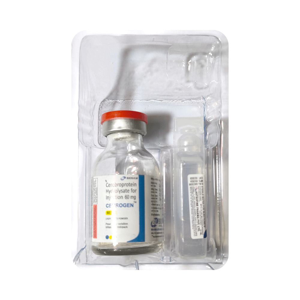 Cebrogen 60 mg Injection is a prescription medicine used in the treatment of stroke, head injury, and Alzheimer's disease. It may be used alone or in combination with other medicines, depending on the illness it is being used for. Cebrogen 60 mg Injection is given under the supervision of a healthcare professional only. You may take it at the same time each day to maintain consistent level of medicine in the blood. If you miss any dose, take it as soon as you remember. Do not skip any doses and finish the full course of treatment even if you feel better. It is important that this medication is not stopped without talking to doctor. Do not take this medicine if you are suffering from epilepsy or severe kidney problem.It is not known to cause serious side effects but injection site reaction (pain or redness), nausea, headache and vertigo may occur. It may also cause dizziness and sleepiness, so do not drive or do anything that requires mental focus until you know how this medicine affects you.