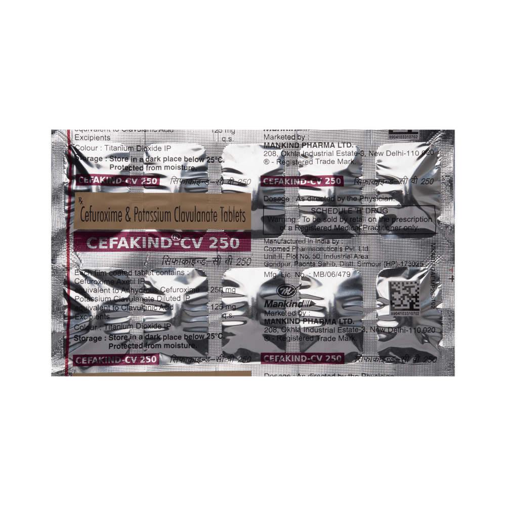 In Treatment of Bacterial infectionsCefakind-CV 250 Tablet contains two different medicines, Cefuroxime and Clavulanic Acid, that work together to kill the bacteria that cause infections. Cefuroxime works by stopping the growth of bacteria. Clavulanic Acid reduces resistance and enhances the activity of Cefuroxime against bacteria.This combination medicine can be used to treat many different bacterial infections such as ear, sinus, throat, lung, urinary tract, skin and soft tissues. It usually makes you feel better within a few days, but you should continue taking it as prescribed even when you feel better to make sure that all bacteria are killed and do not become resistant.