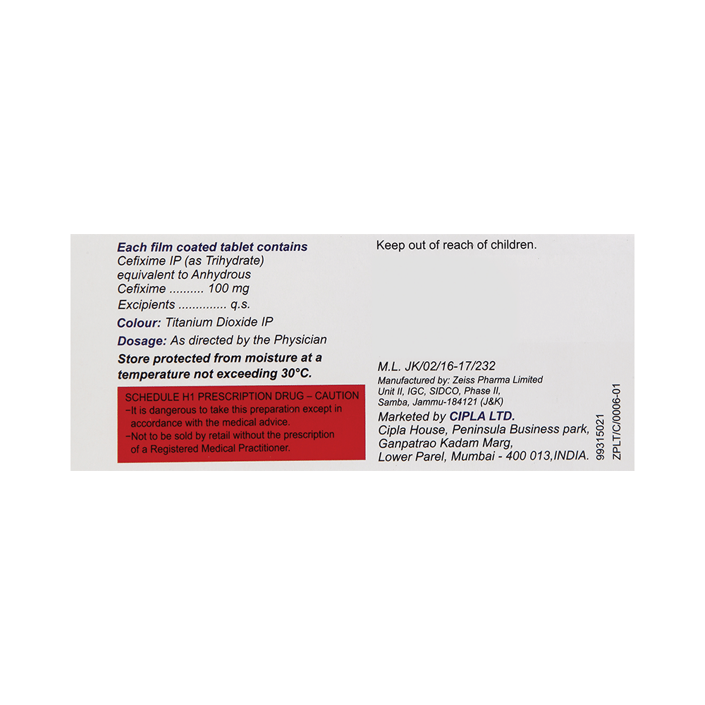 cEFix 100 Tablet is an antibiotic belonging that is used to treat a variety of bacterial infections. It is effective in infections of the respiratory tract (eg. pneumonia), urinary tract, ear, nasal sinus, throat, and some sexually transmitted diseases. cEFix 100 Tablet should be given under the supervision of a doctor or health professional. Use it regularly at evenly spaced intervals as per the schedule prescribed by your doctor. Using it at the same time every day will help you remember to take it. The dose will depend on what you are being treated for, but you should always complete the full course of this antibiotic as prescribed by your doctor. Do not stop taking it until you have finished, even when you feel better. If you stop taking it early, some bacteria may survive and the infection may come back or worsen. It will not work for viral infections such as flu or common cold. Using any antibiotic when you do not need it can make it less effective for future infections.The most common side effects of this medicine include nausea, stomach pain, indigestion, and diarrhea. These are usually mild but let your doctor know if they bother you or do not go away.Before taking it, you should let your doctor know if you are allergic to any antibiotics or have any kidney or liver problems. You should also let your healthcare team know all other medicines you are taking as they may affect, or be affected by this medicine. This medicine is generally regarded as safe to use during pregnancy and breastfeeding if prescribed by a doctor.