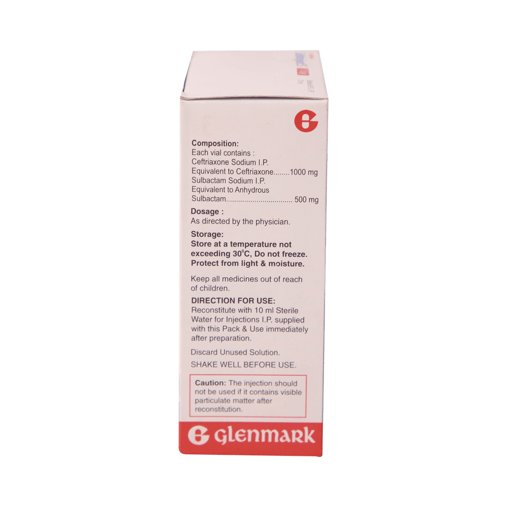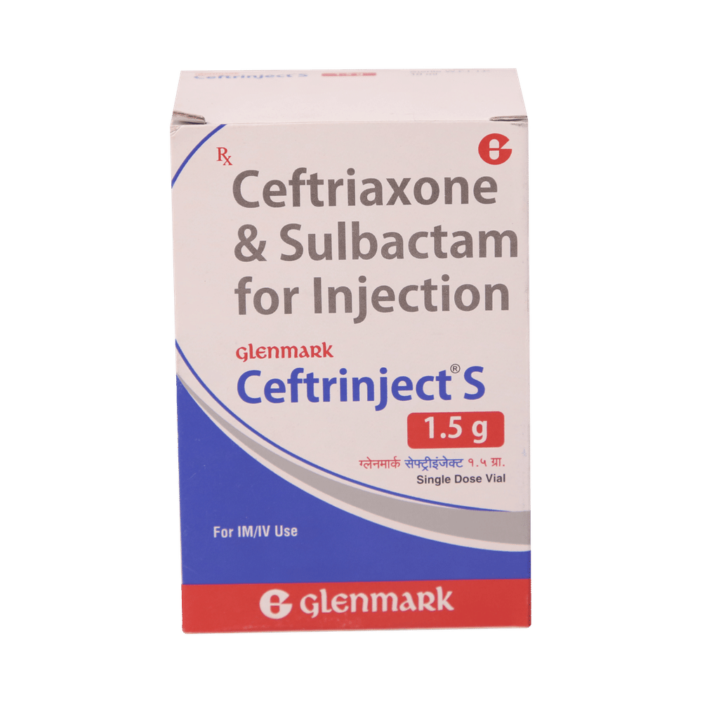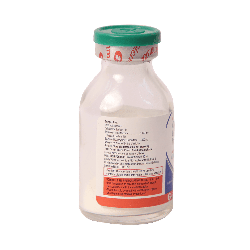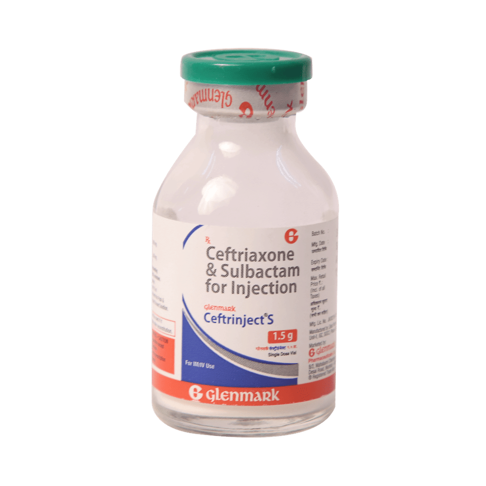 Ceftrinject S 1000mg/500mg Injection is a combination medicine. It is prescribed to treat various types of bacterial infections. It fights against the microorganisms to prevent their growth and further spread of the infection. Ceftrinject S 1000mg/500mg Injection should only be administered under the supervision of a healthcare professional. Do not miss any scheduled appointments for taking this medicine. The course of the treatment must be completed even if you feel better. Sudden discontinuation of the treatment may affect the potency of the medicine.Some common side effects of this medicine are nausea, vomiting, diarrhea, indigestion, etc. If any of the side effects get aggravated, you must consult your doctor immediately. If you experience any allergic reaction (rashes, itching, swelling, shortness of breath, etc.), you must seek immediate medical help.Before taking this medicine, you should tell your doctor if you are taking any medicines for any health condition. Pregnant or breastfeeding women should also consult with their doctor before taking it. Avoid drinking alcohol as it can cause excessive drowsiness with this medicine. It usually does not impair your ability to drive, but you should not drive if it makes you feel sleepy or dizzy. You must take adequate rest for a faster recovery, also take a healthy diet and drink plenty of water. Your doctor may ask for a few laboratory and diagnostic tests to know the effects of the medicine on your body.