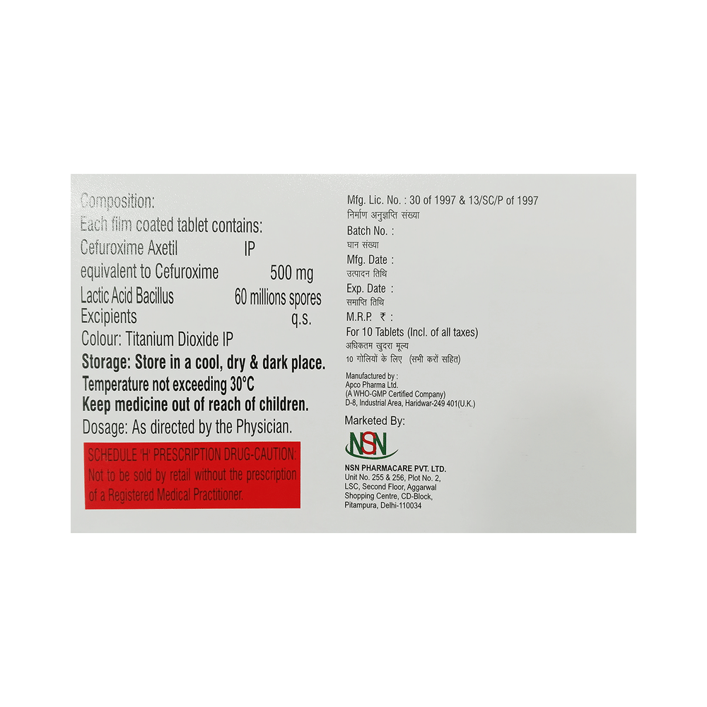 Salt Composition: Cefuroxime (500mg) + Lactobacillus (60Million spores)