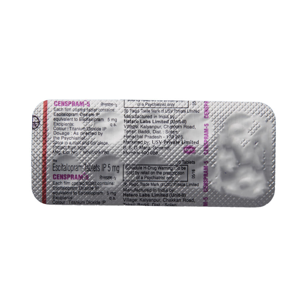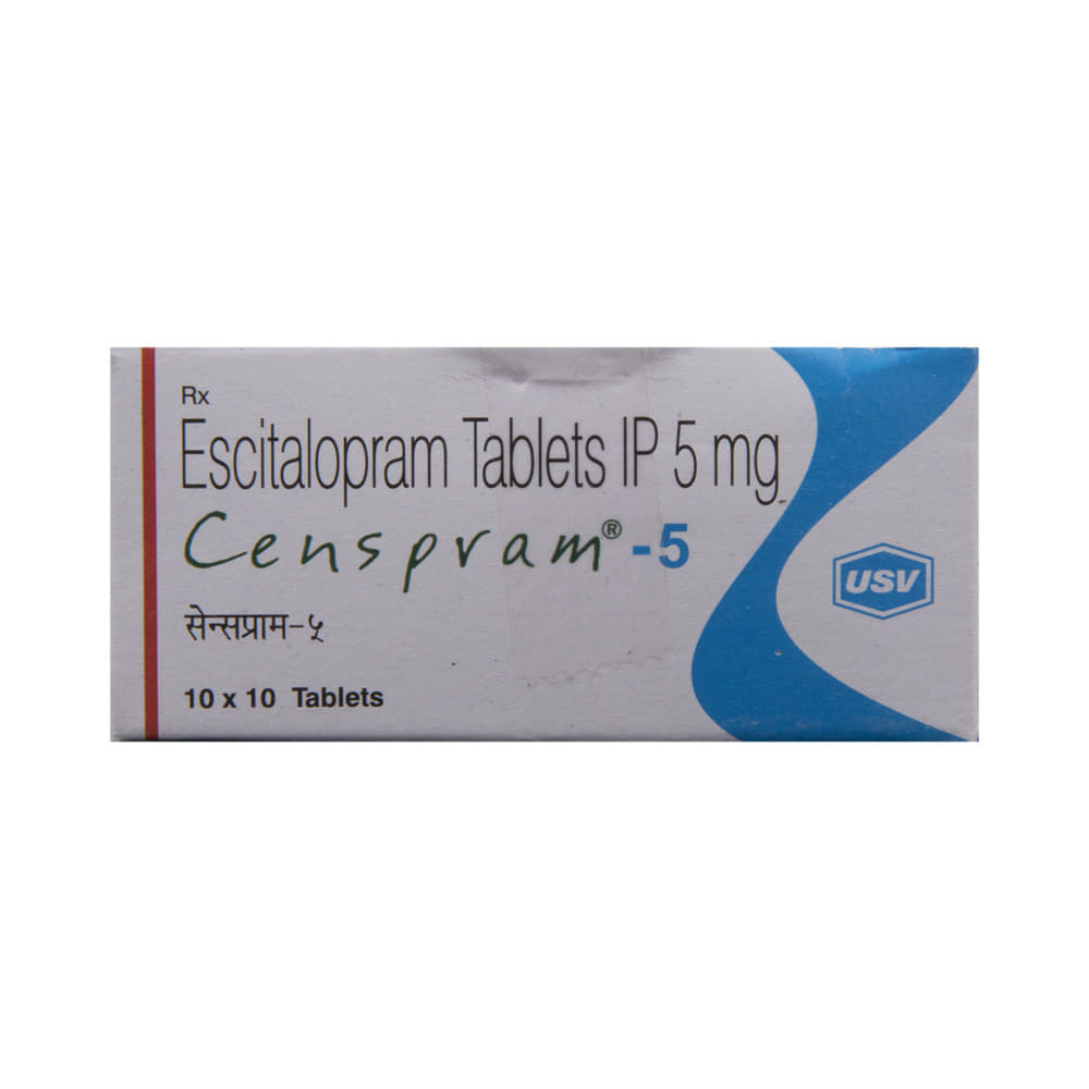 Censpram 5 Tablet is widely prescribed to treat depression and other mental health conditions like anxiety, panic disorder, and obsessive-compulsive disorder. It is a type of antidepressant known as a selective serotonin reuptake inhibitor (SSRI). Censpram 5 Tablet helps recover from depression by improving mood and relieving anxiety and tension. It can be taken with or without food. The dose and how often you need it will be decided by your doctor based on the amount needed to control your symptoms. Your doctor may start you on a lower dose and increase it gradually. Do not change the dose or stop taking it without talking to your doctor, even if you feel well. Doing so may make your condition worse or you may suffer from unpleasant withdrawal symptoms such as anxiety, restlessness, palpitations, dizziness, sleep disturbances.To get the most benefit, take this medicine regularly at the same time each day. Your doctor may advise you to take it in the morning if you have trouble sleeping. It may take a few weeks before you start feeling better. Let your doctor know if you do not see any improvement even after 4 weeks.Some common side effects of this medicine include nausea, fatigue, increased sweating, insomnia (difficulty in sleeping), decreased sexual drive, delayed ejaculation, and women may experience difficulties achieving orgasm. Some people may experience sleepiness after taking this medicine. Let your doctor know straight away if you develop any sudden worsening of mood or any thoughts about harming yourself.Before taking Censpram 5 Tablet, you should tell your doctor if you have epilepsy (seizure disorder or fits), diabetes, liver or kidney disease, any heart problems, or are currently taking medicines for depression known as MAO inhibitors. These may affect your treatment. Please tell your doctor about all the medicines you are taking to make sure you are safe.