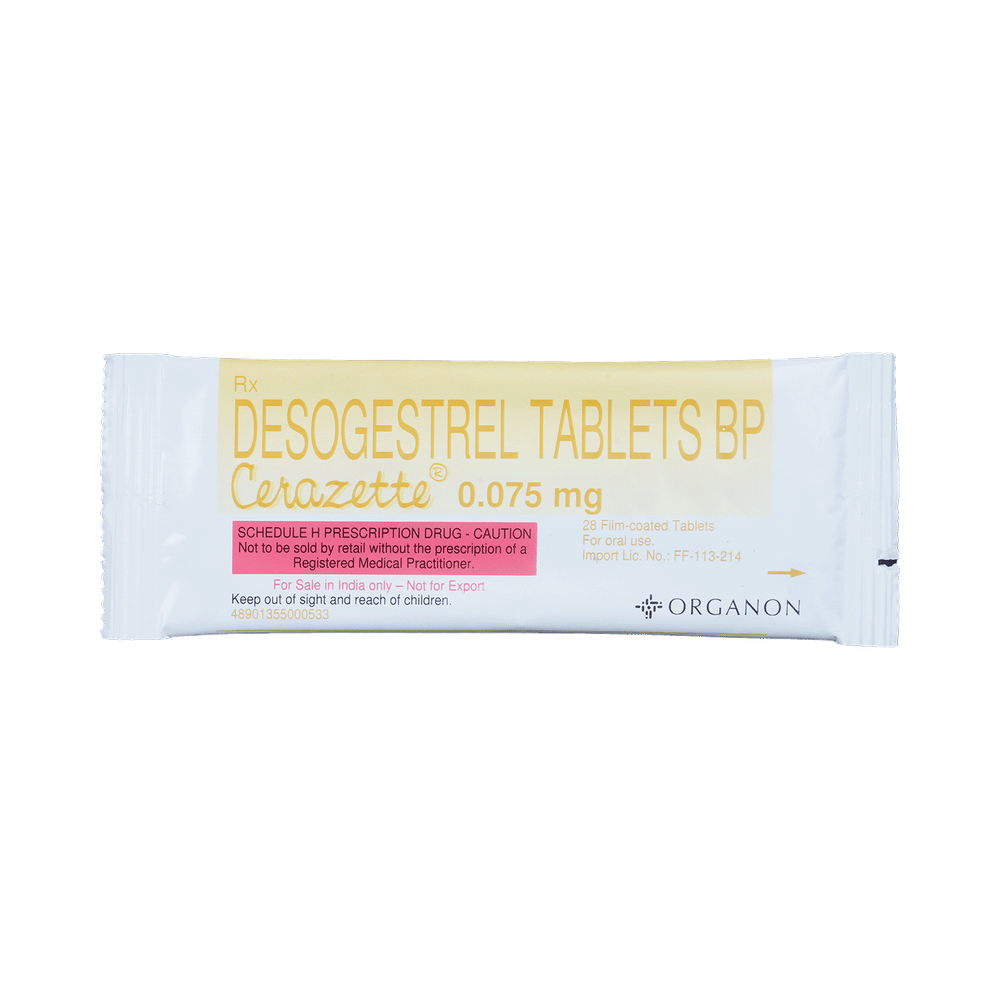 Cerazette Tablet is a medicine used as an oral contraceptive to prevent pregnancy. It helps to prevent the release and fertilization of the egg by sperm. It is generally safe for the majority of women, including those who are breastfeeding. Cerazette Tablet can be taken with or without food, but take it at the same time to get the most benefit. It should be taken as your doctor's advice. The doctor should guide the dose and how often you take it. Swallow the tablet whole with a glass of water. You should take this medicine for as long as it is prescribed for you. If you missed your dose and you are late by 12 hours in taking the missed dose, in that case, you must use a condom during intercourse for a period of 2 days.The most common side effects of this medicine include headache, nausea, vomiting, weight gain, and acne. If these side effects persist or worsen, consult your doctor. They may suggest ways to minimize or prevent them.Cerazette Tablet can often disrupt your menstrual cycle, so consult your doctor if this happens regularly. Before using this medication, inform your doctor if you have a history of diabetes, unexplained vaginal bleeding, or high blood pressure. Your doctor should also know about all other medicines you are taking, as many of these may make this medicine less effective or change the way it works. Generally, if you experience vomiting within 2 hours of dose intake, take another dose as soon as you feel better.