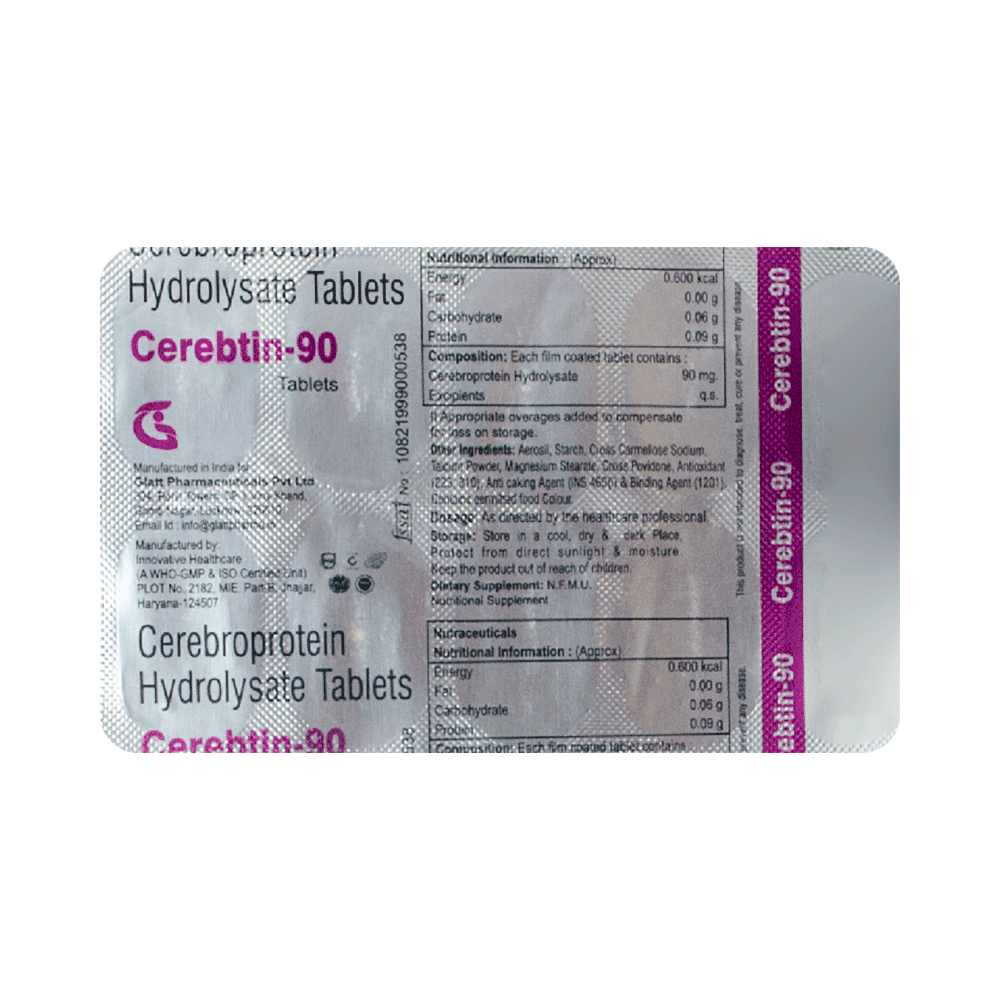 Cerebtin 90 Tablet is a prescription medicine used in the treatment of stroke, head injury, and Alzheimer's disease. It may be used alone or in combination with other medicines, depending on the illness it is being used for. Cerebtin 90 Tablet may be taken with or without food. However, it is advised to take it at the same time each day as this helps to maintain a consistent level of medicine in the body. Take this medicine in the dose and duration as advised by your doctor. Do not stop taking it suddenly without talking to your doctor as it may worsen your symptoms.Some common side effects that may be seen with this medicine include headache, nausea, vertigo, increased sweating, agitation, fever, hallucinations, confusion. However, these are temporary and usually resolve on their own. Consult your doctor if these do not subside or get worse.Before taking this medicine, inform your doctor if you ever had any problems with your kidneys or if you have or ever had any seizures (epilepsy or fits). Your dose depends on your age and the condition you are being treated for. Always let your doctor know about all the medicines that you are taking before you start with your treatment. Please inform your doctor if you are pregnant, planning to conceive or breastfeeding, before using this medicine.