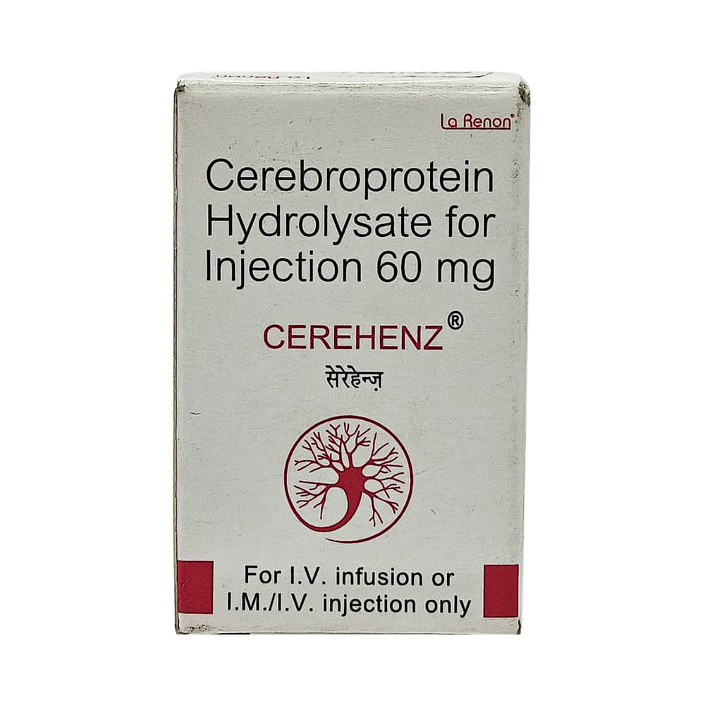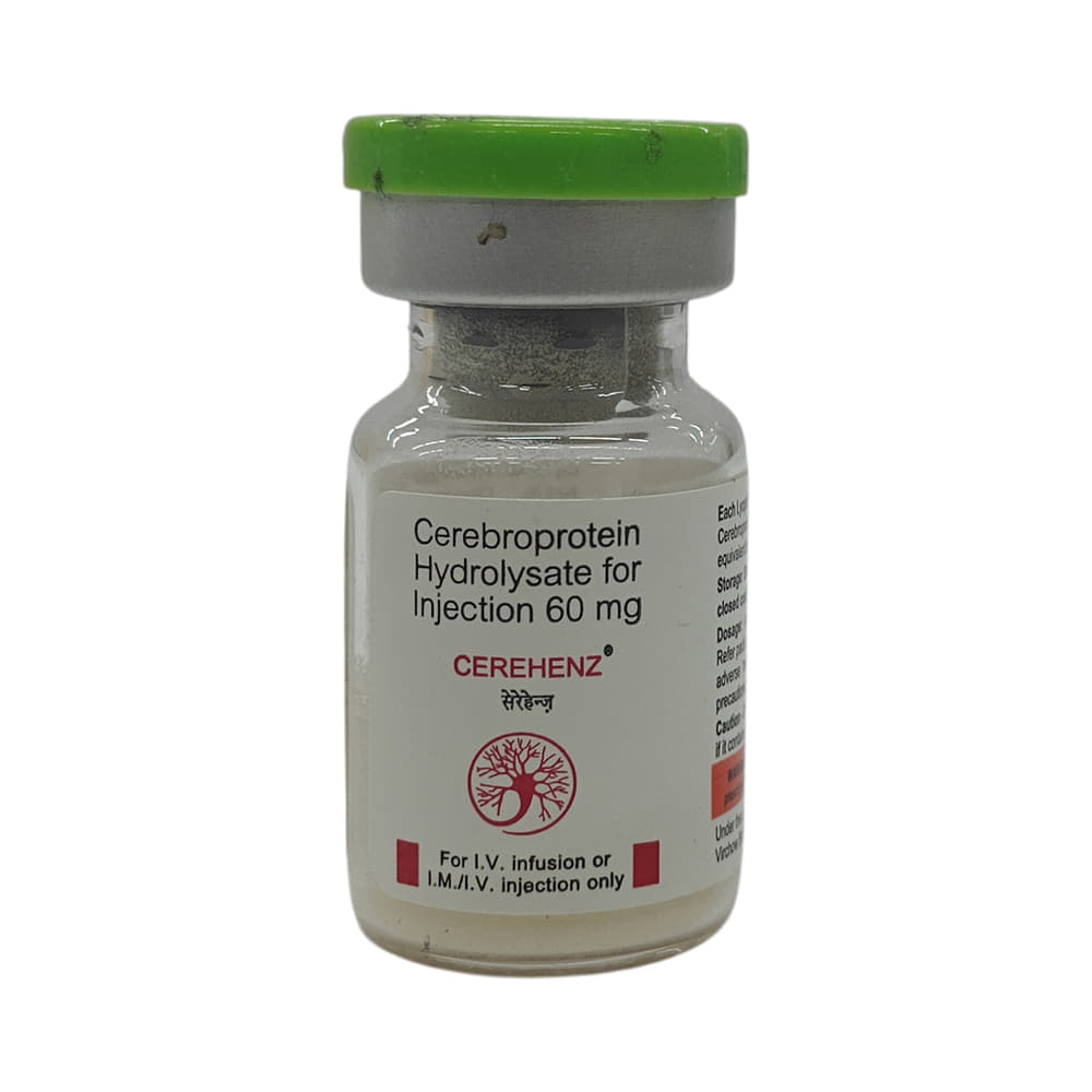 Cerehenz 60mg Injection is a prescription medicine used in the treatment of stroke, head injury, and Alzheimer's disease. It may be used alone or in combination with other medicines, depending on the illness it is being used for. Cerehenz 60mg Injection is given under the supervision of a healthcare professional only. You may take it at the same time each day to maintain consistent level of medicine in the blood. If you miss any dose, take it as soon as you remember. Do not skip any doses and finish the full course of treatment even if you feel better. It is important that this medication is not stopped without talking to doctor. Do not take this medicine if you are suffering from epilepsy or severe kidney problem.It is not known to cause serious side effects but injection site reaction (pain or redness), nausea, headache and vertigo may occur. It may also cause dizziness and sleepiness, so do not drive or do anything that requires mental focus until you know how this medicine affects you.