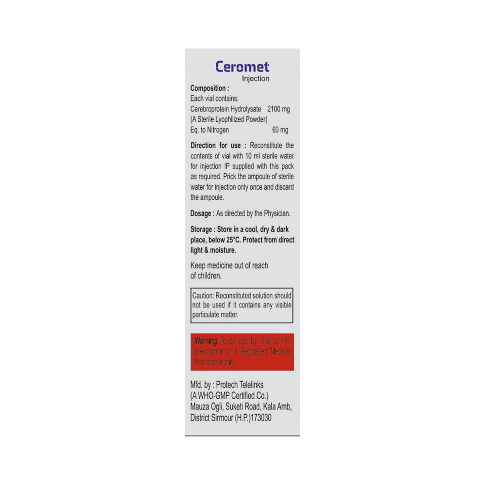 Ceromet Injection is a prescription medicine used in the treatment of stroke, head injury, and Alzheimer's disease. It may be used alone or in combination with other medicines, depending on the illness it is being used for. Ceromet Injection is given under the supervision of a healthcare professional only. You may take it at the same time each day to maintain consistent level of medicine in the blood. If you miss any dose, take it as soon as you remember. Do not skip any doses and finish the full course of treatment even if you feel better. It is important that this medication is not stopped without talking to doctor. Do not take this medicine if you are suffering from epilepsy or severe kidney problem.It is not known to cause serious side effects but injection site reaction (pain or redness), nausea, headache and vertigo may occur. It may also cause dizziness and sleepiness, so do not drive or do anything that requires mental focus until you know how this medicine affects you.