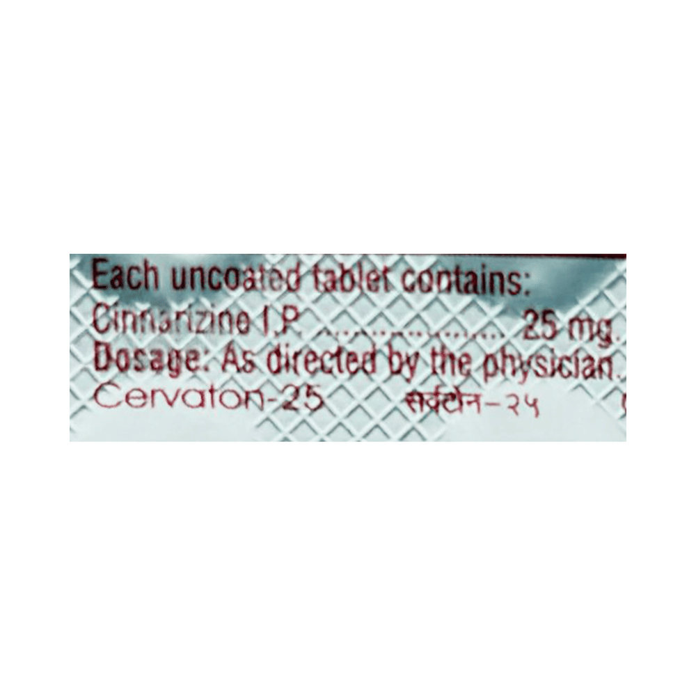 In Treatment of Motion sicknessMotion sickness is a condition caused due to motion during travel. You may experience a spinning sensation (vertigo), nausea, or vomiting as a result of this condition. Cervaton 25 Tablet helps treat these symptoms effectively. Take it as prescribed by the doctor to get maximum benefit.In Treatment of VertigoVertigo means a spinning sensation or dizziness that is triggered due to frequent movement. It can happen due to many reasons but it may also occur without any underlying disease. Cervaton 25 Tablet helps treat this sensation effectively. If you feel dizzy while getting up from the bed, sit for a while, and then rise slowly to avoid having an accidental fall.In Treatment of Meniere's diseaseCervaton 25 Tablet helps in improving blood flow to the inner ear which reduces the pressure of excess fluid there. It is this pressure that is thought to cause the symptoms of nausea, vertigo (dizziness), tinnitus (ringing in your ears), and hearing loss in people who have Meniere’s disease. Cervaton 25 Tablet makes the symptoms milder and reduces the number of times you get the symptoms. It will be more effective if you take this medicine regularly as prescribed so try not to miss doses. It may take a couple of weeks before you notice any improvements but keep taking it, even if you do feel better, until your doctor advises it is safe to stop.show moreshow less