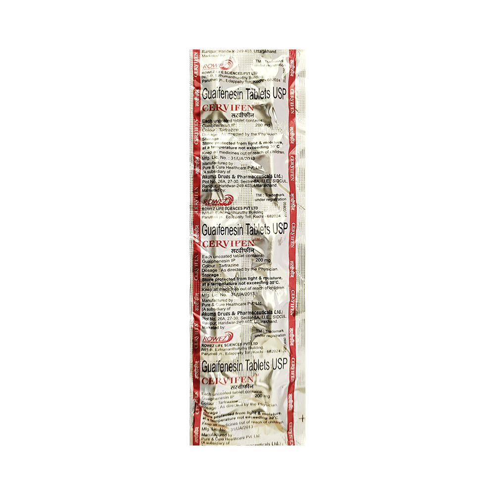 Cervifen Tablet is an expectorant. It is used for the treatment of cough and congestion. It helps in bringing mucus out of the lungs thus helps in treating cough. Cervifen Tablet can be taken with or without food, but take it at the same time to get the most benefit. It should be taken as per your doctor's advice. The dose and how often you take it depends on what you are taking it for. Your doctor will decide how much you need to improve your symptoms. You should take this medicine for as long as it is prescribed for you. In case, you have missed any doses than it is better to take the next dose as soon as you remember it. However, you should never take a double dose.The most common side effects of this medicine include nausea, vomiting, stomach pain, diarrhea, and dizziness. If these bother you or appear serious, let your doctor know. There may be ways of reducing or preventing them. To overcome dizziness, avoid driving and attention-seeking activity while on treatment.Before taking this medicine, let your doctor know if you have liver or kidney disease or if you are pregnant or breastfeeding. Your doctor should also know about all other medicines you are taking as many of these may make this medicine less effective or change the way it works. Generally, it is advised to avoid alcohol while on treatment.