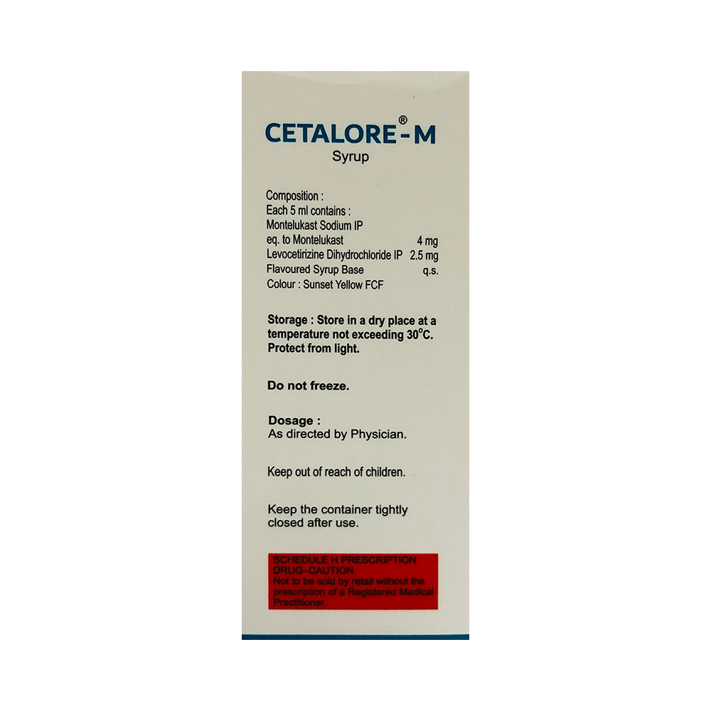Cetalore-M Syrup Delicious Mixed Fruit is commonly prescribed in children to treat symptoms of allergy such as runny nose, sneezing, itching, swelling, congestion, and watery eyes. It may also help in the treatment of asthma and skin allergies. Give this medicine to your child at a fixed time before or after food in the prescribed dose, time, and way. For asthma, prefer giving Cetalore-M Syrup Delicious Mixed Fruit in the evening or 2 hours before physical activity. For allergy, it is best to give it either in the morning or in the evening, depending upon the time of onset of symptoms. In case your child has both, prefer giving it in the evening. If your child vomits within 30 minutes of taking this medicine, give the same dose again, but skip it if it’s already time for the next dose.Your child may start to feel better after a few regular doses. However, you must still complete the prescribed dose to ensure maximum benefit. Moreover, stopping the medicine abruptly may worsen your child’s condition. This medicine may cause some minor and temporary side effects like vomiting, diarrhea, nausea, dizziness, dry mouth, rash, and headache. Usually, these episodes subside once your child’s body adapts to the medicine. However, in case these effects persist or start bothering your child, consult your child’s doctor without any delay.Let your child’s doctor know if your child is already taking any medicines. Also, narrate your child’s complete medical history, including any prior episodes of allergy, heart problem, blood disorder, vascular disorders, birth defects, airway obstruction, lung anomaly, skin disorder, liver impairment, and kidney malfunction. This information is critical for dose alterations and in planning your child’s overall treatment.