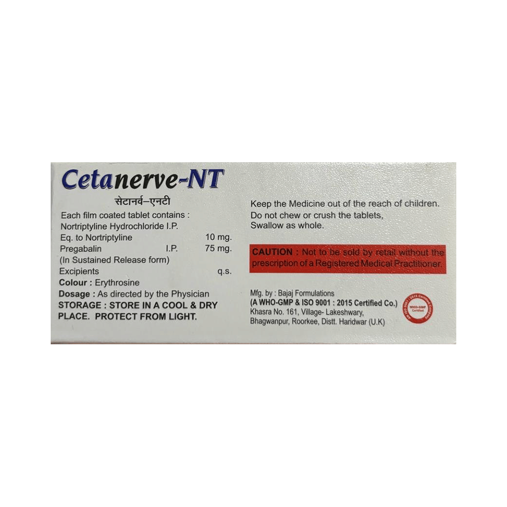 Cetanerve-NT Tablet SR is a combination of two medicines: Pregabalin and Nortriptyline. Pregabalin is an alpha-2 delta ligand that decreases pain by modulating the calcium channel activity of the nerve cells. Nortriptyline is a tricyclic antidepressant that increases the levels of chemical messengers (serotonin and noradrenaline) that stop the movement of pain signals in the brain. Together, they relieve neuropathic pain (pain from damaged nerves).