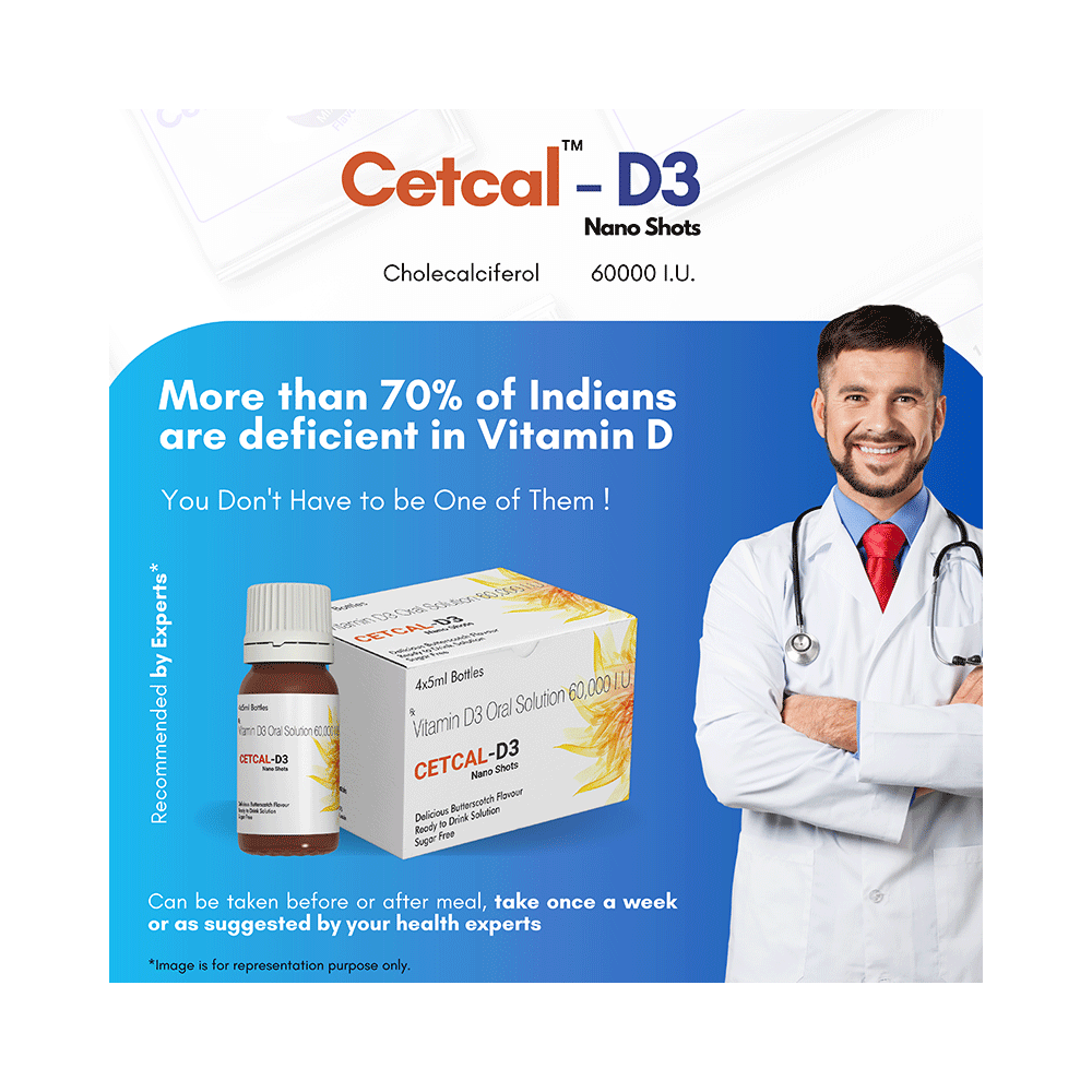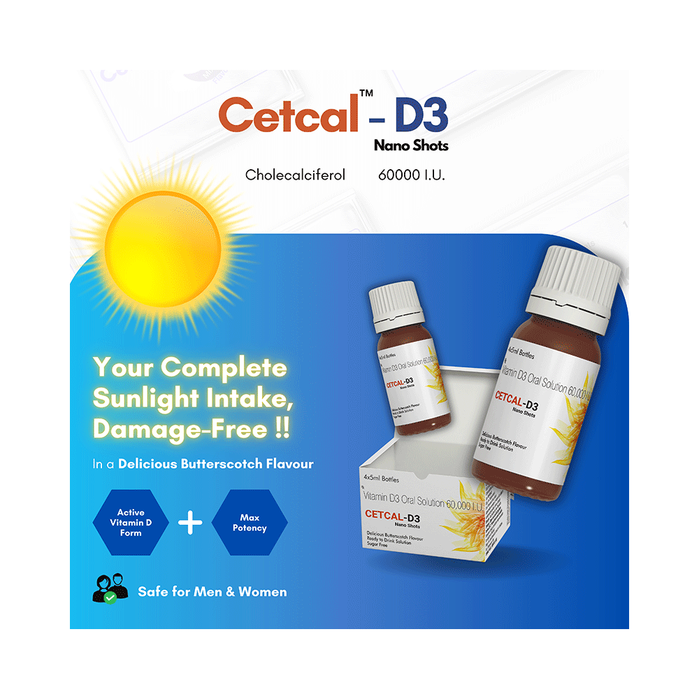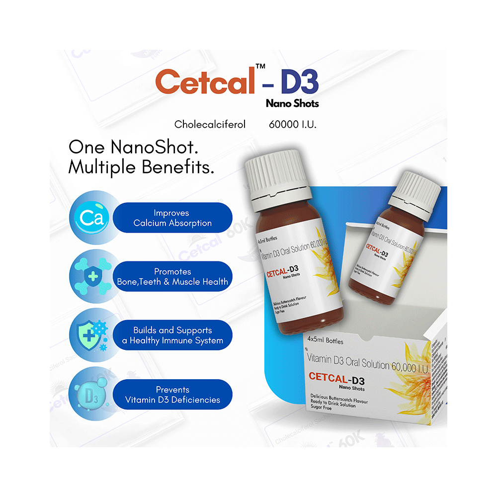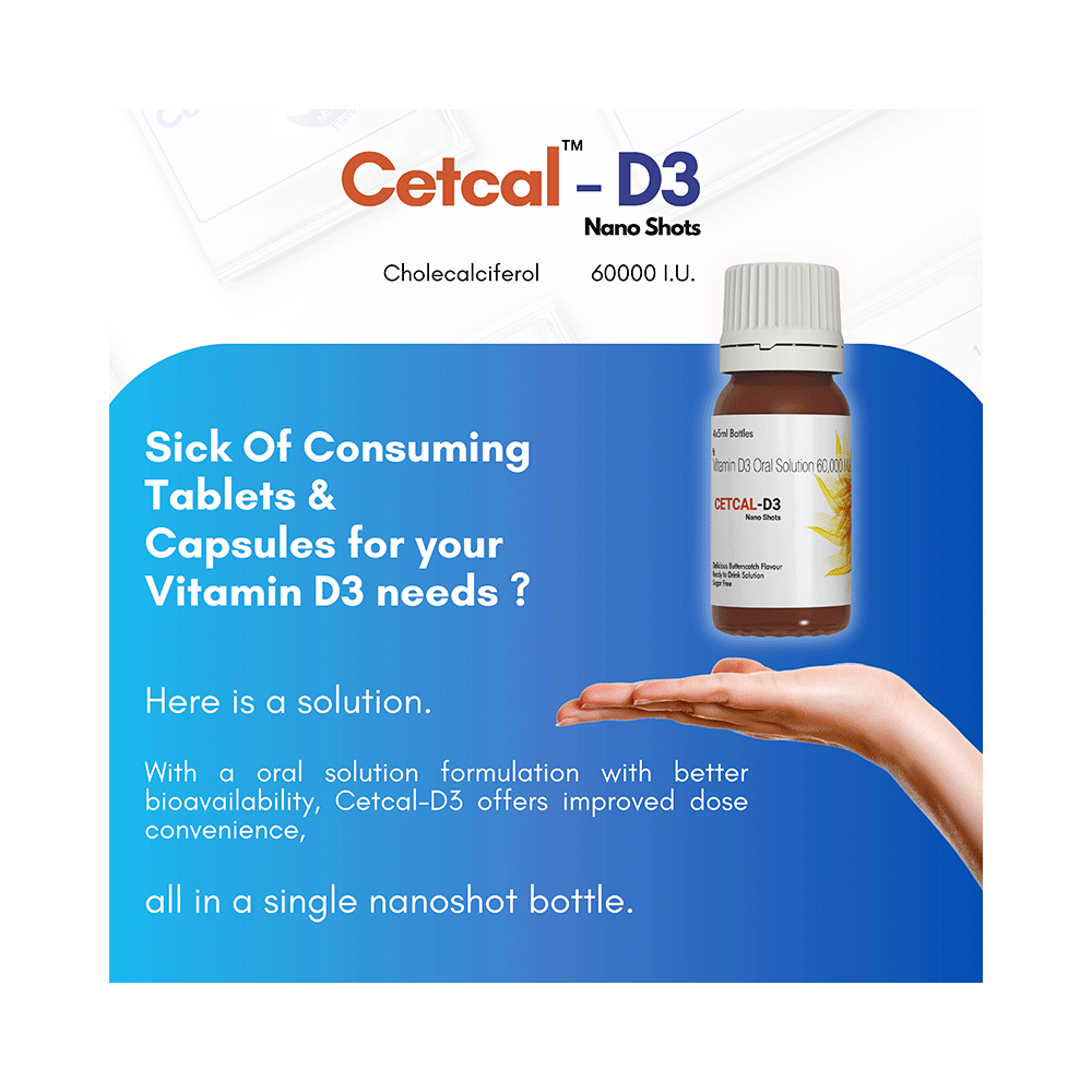 Cetcal-D3 Nano Shots (5ml Each) Delicious Butterscotch Sugar Free is used in the treatment of vitamin D deficiency and osteoporosis. It helps the body to absorb calcium. Calcium is essential for maintaining strong and healthy bones. It is used when your diet does not provide enough calcium. Cetcal-D3 Nano Shots (5ml Each) Delicious Butterscotch Sugar Free should be taken as directed by your doctor. It is best taken with or after food, as this helps your body absorb it, and you should take it regularly to get the most benefits. If you are using it to treat osteoporosis, you will also be prescribed other medicines. This medicine may be only part of a complete treatment program that includes making changes to your diet and taking calcium and vitamin supplements. Learn about the foods you should eat to ensure you get enough calcium and vitamin D.Cetcal-D3 Nano Shots (5ml Each) Delicious Butterscotch Sugar Free has few side effects, and none are common. If you take too much, you may feel weakness, muscle pain, or a metallic taste in your mouth. If you experience any such side effects, speak with your doctor. They may be able to help you reduce or treat the symptoms.Before taking this medicine, tell your doctor if you have high calcium levels in your blood or if you have any heart, kidney, or liver disease. Some other medicines can decrease the absorption of vitamin D3, so let your doctor know about all the other medicines you are taking to make sure you are safe. This medicine may help during pregnancy when your body needs more vitamin D, but too much could harm your baby. Discuss it with your doctor.