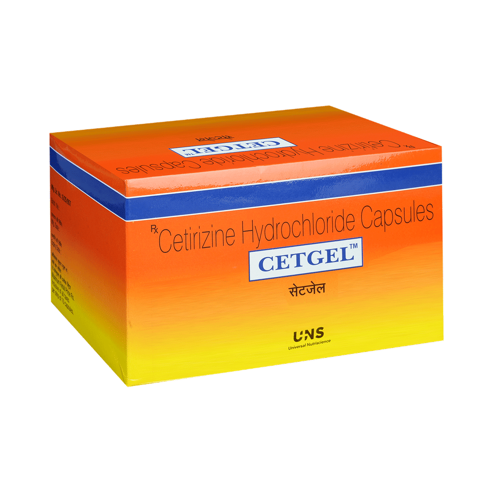 Cetgel Capsule belongs to a group of medicines called antihistamines. It is used to treat various allergic conditions such as hay fever, conjunctivitis and some skin reactions, and reactions to bites and stings. It relieves watery eyes, runny nose, sneezing, and itching. Cetgel Capsule can be taken with or without food. The dose required for you may vary depending on what you are taking it for. This medicine is usually taken in the evening but follow the advice of your doctor on how to take it. You may need this medicine only on days you have symptoms, but if you are taking it to prevent symptoms you should take it regularly. If you miss doses or stop taking it earlier than advised, your symptoms may come back.This medicine is generally very safe. The most common side effects include feeling sleepiness, dizziness, tiredness, and sore throat. These are usually mild and go away after a couple of days as your body adjusts. Consult your doctor if any of the side effects persist or worry you. You should avoid alcohol while taking this medicine.Before taking it, tell your doctor if you have any kidney problems or epilepsy. Your dose may need to be modified or this medicine may not be suitable. Some other medicines can interact with this medicine so let your healthcare team know what else you are taking. You should also talk to your doctor before using this medicine if you are pregnant or breastfeeding, although it is not thought to be harmful.