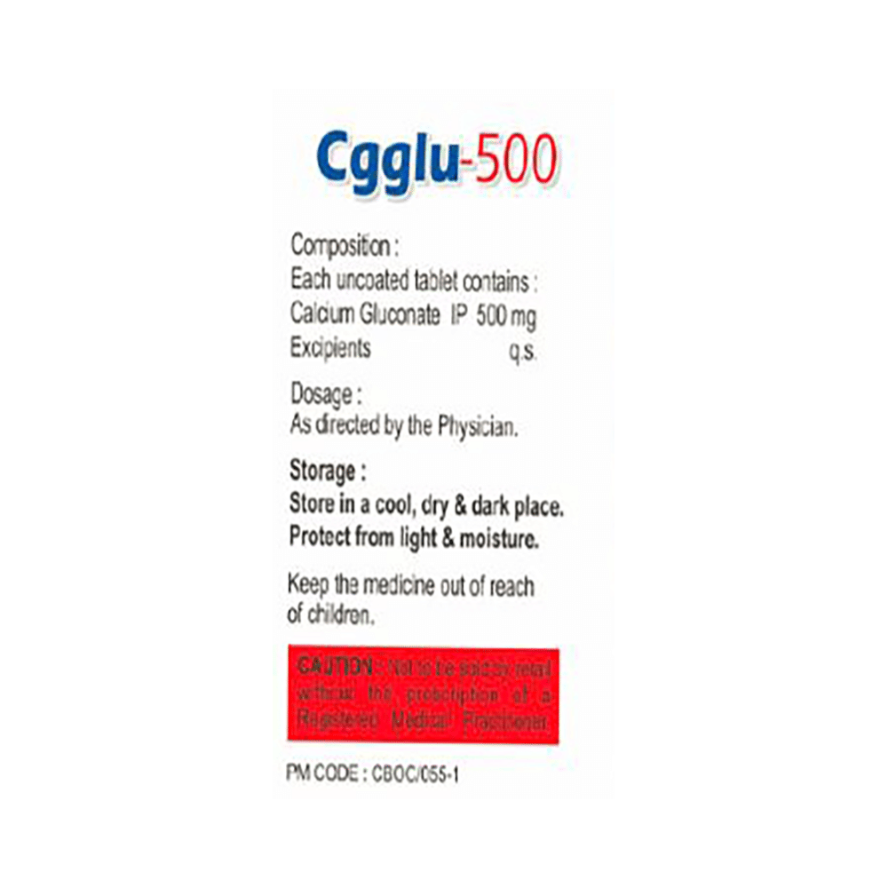 Cgglu 500 Tablet is a mineral supplement used to treat or prevent calcium deficiency in the body. It is commonly used in conditions such as low blood calcium levels (hypocalcemia), osteoporosis, rickets, and other muscle disorders. It provides extra calcium to the body and helps restore normal calcium levels. Take Cgglu 500 Tablet exactly as prescribed by your doctor. They are usually taken with meals to enhance absorption and reduce the risk of stomach upset. Take it regularly and take it at the same time each day for the best results. In addition to taking this medicine, maintain a balanced diet rich in calcium and vitamin D, and engage in regular weight-bearing exercises if advised.Cgglu 500 Tablet is generally well tolerated with little or no side effects. However, some may experience mild side effects such as constipation, gas, or an upset stomach. Drinking plenty of water, eating a fiber-rich diet, and staying active can help prevent constipation. If you experience any symptoms that persist or get worse, consult your doctor.Let your doctor know if you have a history of kidney stones, heart disease, or conditions that cause high calcium levels, such as hyperparathyroidism or certain cancers. Avoid taking more than the recommended dose, as too much calcium can be harmful. Also, inform your doctor about all the medicines and supplements you are taking, as calcium can interfere with the absorption of other drugs.