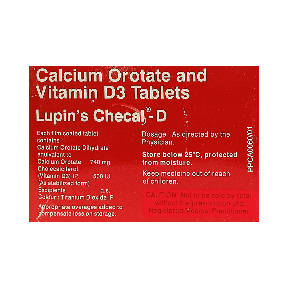 Checal -D Tablet consists of calcium orotate and vitamin D3. Calcium orotate as a source of calcium prevents or treats calcium deficiency. Vitamin D3 helps maintain blood calcium and phosphorus levels and mineralisation of bone. When you don't get enough vitamin D from food sources and sunlight exposure, Checal -D Tablet helps replenish those low levels.