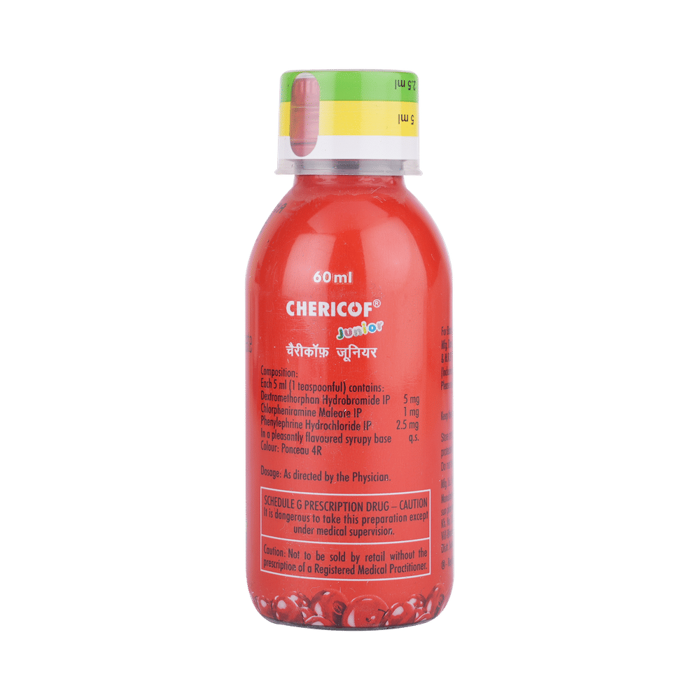 Chericof Junior Syrup is a combination of three medicines: Phenylephrine, Chlorpheniramine Maleate, and Dextromethorphan Hydrobromide. Phenylephrine is a decongestant which narrows the small blood vessels providing relief from congestion or stuffiness in the nose. Chlorpheniramine Maleate is an antiallergic which relieves allergy symptoms like runny nose, watery eyes and sneezing. Dextromethorphan Hydrobromide is a cough suppressant which relieves cough by reducing the activity of cough center in the brain.