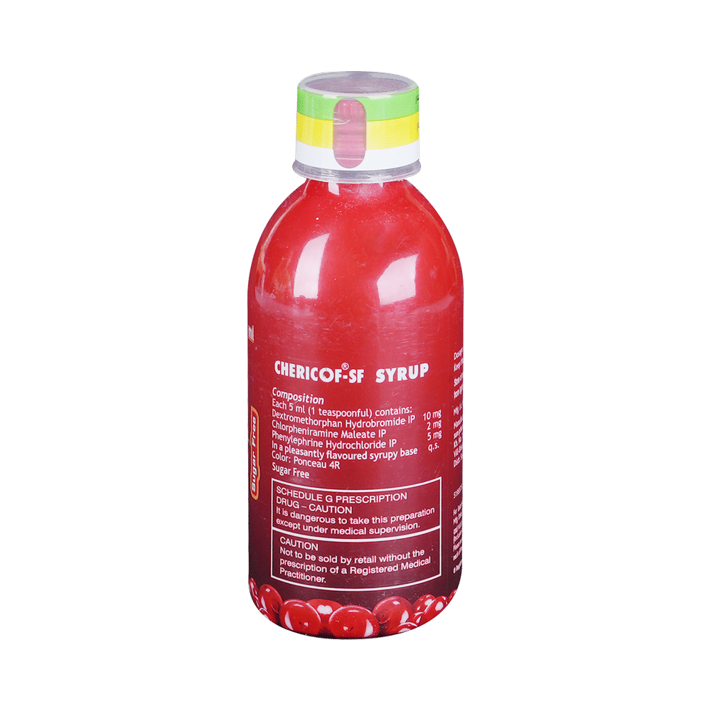 Chericof-SF Syrup Sugar Free is a medicine used in the treatment of common cold and cough. It can provide quick relief from cough and common cold symptoms like runny nose, stuffy nose, sneezing, watery eyes, and congestion or stuffiness. Chericof-SF Syrup Sugar Free is taken with or without food in a dose and duration as advised by the doctor. The dose you are given will depend on your condition and how you respond to the medicine. You should keep taking this medicine for as long as your doctor recommends. If you stop treatment too early your symptoms may come back and your condition may worsen. Let your healthcare team know about all other medications you are taking as some may affect, or be affected by this medicine.Common side effects of this medicine include headache, sedation, double vision, vomiting, diarrhea, dry mouth, and nausea. Most of these are temporary and usually resolve with time. Contact your doctor straight away if you are at all concerned about any of these side effects. This medicine can also cause sleepiness, so do not drive or do anything that requires mental focus until you know how this medicine affects you. Avoid drinking alcohol while taking this medicine as it can worsen your sleepiness.Never support self-medication or recommend your medicine to another person. It is beneficial to have plenty of fluids while taking this medication. Before taking this medicine, you should tell your doctor if you are pregnant, planning pregnancy or breastfeeding. You should also tell your doctor if you have any kidney or liver diseases so that your doctor can prescribe a suitable dose for you.