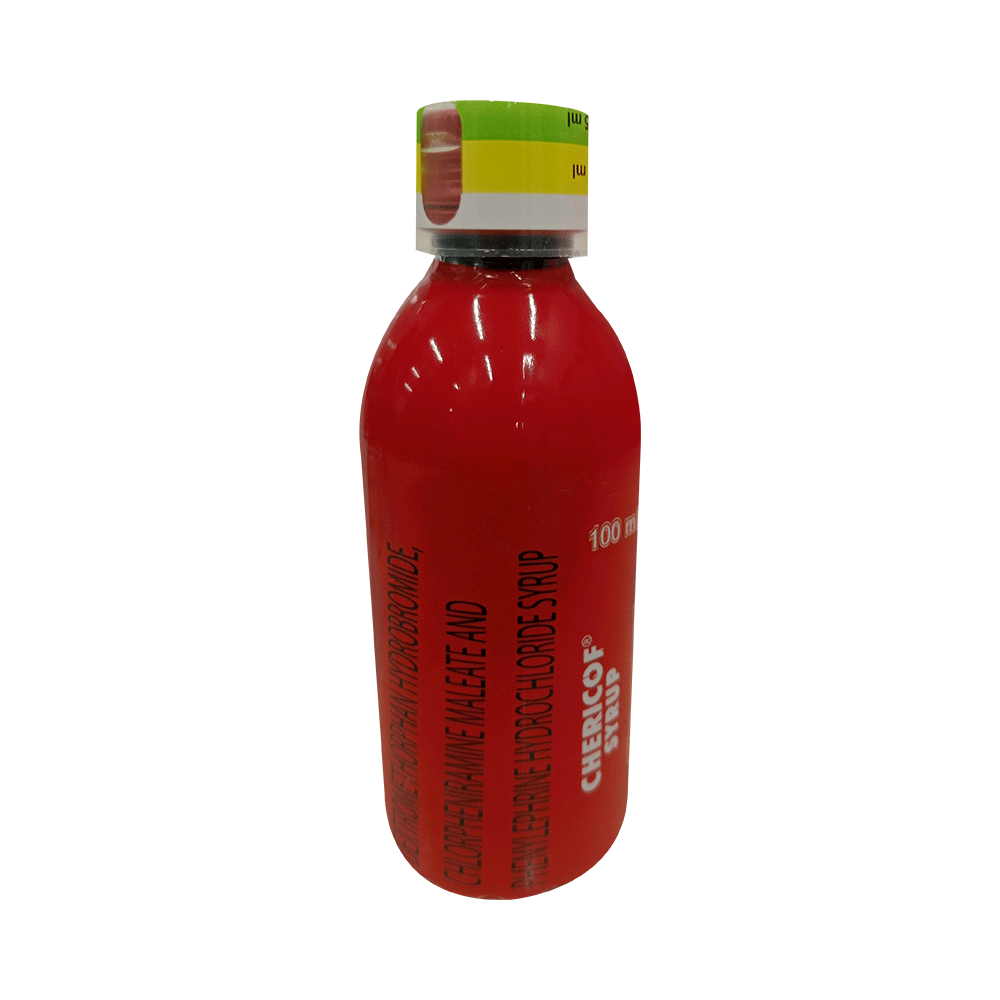 Chericof Syrup is a combination of three medicines: Phenylephrine, Chlorpheniramine Maleate, and Dextromethorphan Hydrobromide. Phenylephrine is a decongestant which narrows the small blood vessels providing relief from congestion or stuffiness in the nose. Chlorpheniramine Maleate is an antiallergic which relieves allergy symptoms like runny nose, watery eyes and sneezing. Dextromethorphan Hydrobromide is a cough suppressant which relieves cough by reducing the activity of cough center in the brain.