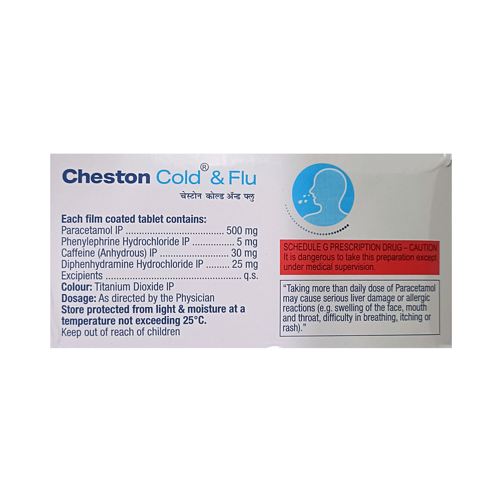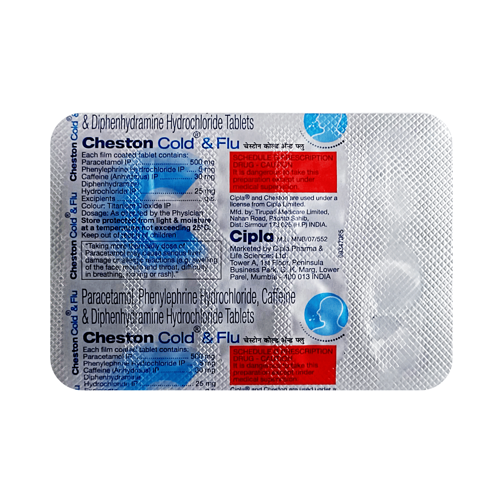 Cheston Cold and Flu Tablet is a combination of four medicines: caffeine, diphenhydramine, paracetamol, and phenylephrine, which relieve common cold symptoms. Diphenhydramine is an antiallergic that relieves allergy symptoms like a runny nose, watery eyes, and sneezing. Paracetamol is an analgesic (pain reliever) and an antipyretic (fever reducer). It blocks the release of certain chemical messengers in the brain that are responsible for pain and fever. Caffeine increases the effectiveness of paracetamol and decreases the sleepiness caused by diphenhydramine. Phenylephrine is a decongestant that narrows the small blood vessels, providing temporary relief from congestion or stuffiness in the nose.