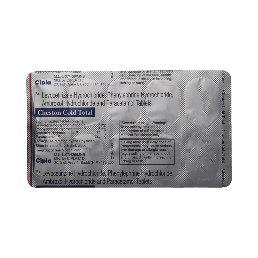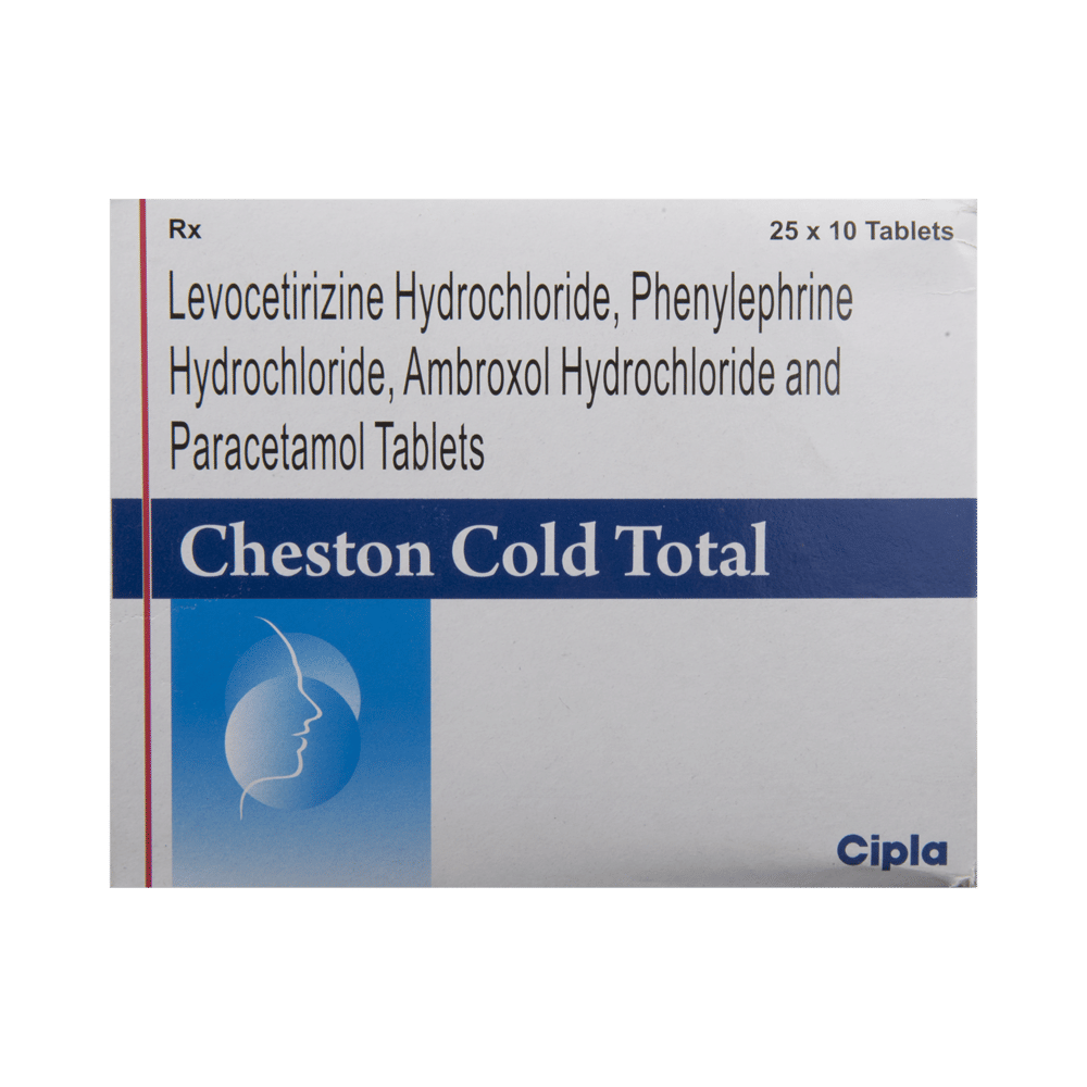 Cheston Cold Total Tablet is a combination medicine used to treat common cold symptoms. It thins mucus in the nose, windpipe, and lungs making it easier to cough out. It also provides relief from seasonal allergic conditions such as runny nose, watery eyes, sneezing, and congestion or stuffiness. Cheston Cold Total Tablet is taken with or without food in a dose and duration as advised by the doctor. The dose you are given will depend on your condition and how you respond to the medicine. You should keep taking this medicine for as long as your doctor recommends. If you stop treatment too early your symptoms may come back and your condition may worsen. Let your doctor know about all other medications you are taking as some may affect, or be affected by this medicine.The most common side effects are nausea, vomiting, dryness in mouth, stomach upset, headache, fatigue, loss of appetite, and insomnia. Most of these are temporary and usually resolve with time. Contact your doctor straight away if you are at all concerned about any of these side effects. It can also cause dizziness and sleepiness, so do not drive or do anything that requires mental focus until you know how this medicine affects you. Avoid drinking alcohol while taking this medicine as it can make dizziness worse.Before taking it, you should tell your doctor if you have any liver diseases so that your doctor can prescribe a suitable dose for you. Also tell your doctor if you are pregnant, planning pregnancy or breastfeeding.