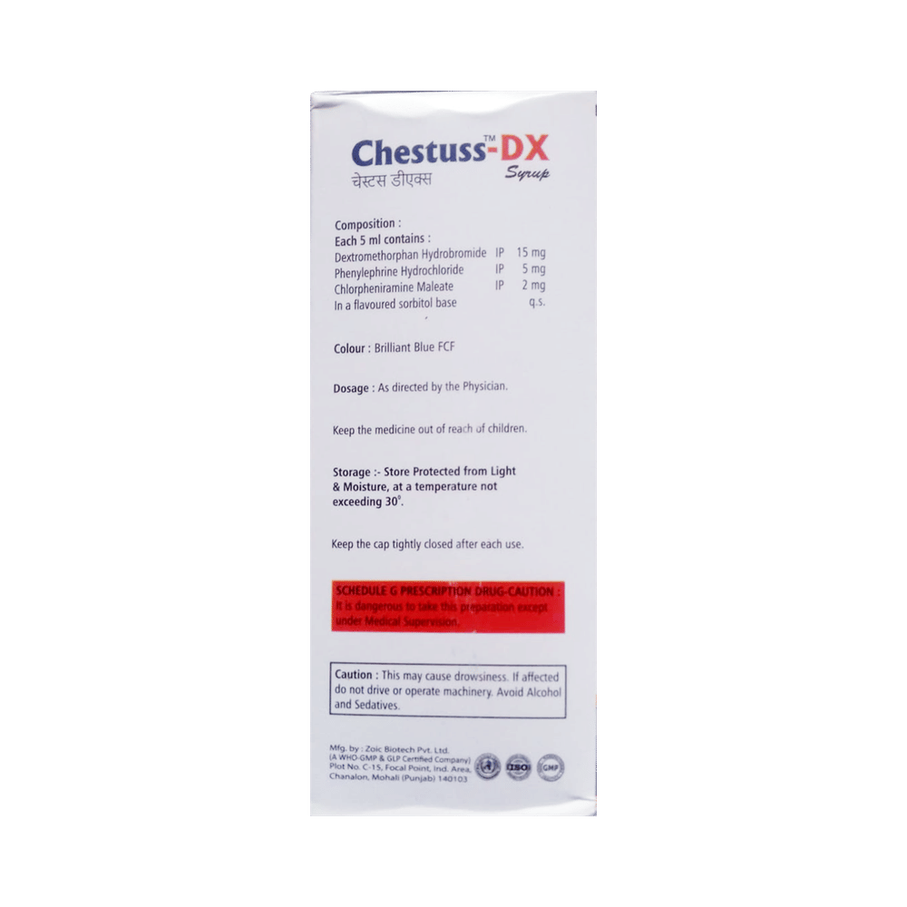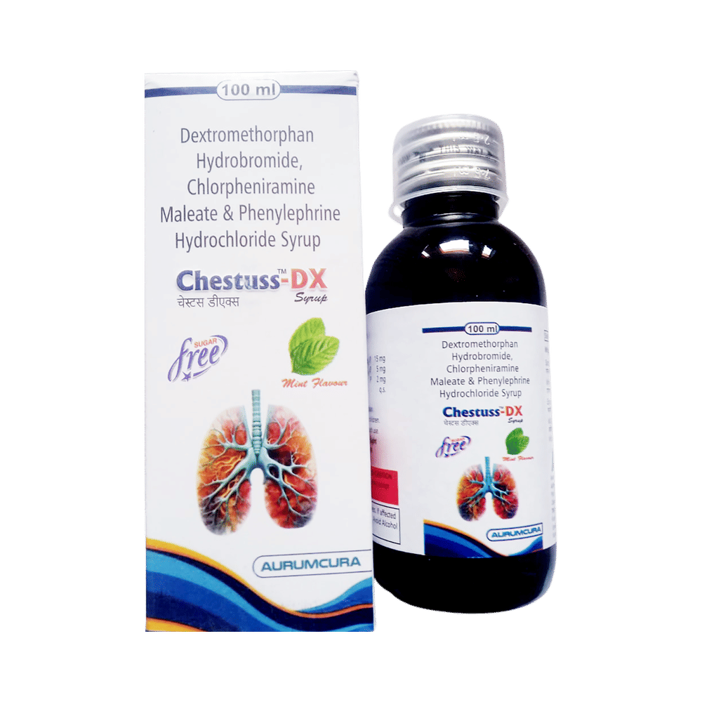Chestuss-DX Syrup Mint Sugar Free is a medicine used in the treatment of common cold and cough. It can provide quick relief from cough and common cold symptoms like runny nose, stuffy nose, sneezing, watery eyes, and congestion or stuffiness. Chestuss-DX Syrup Mint Sugar Free is taken with or without food in a dose and duration as advised by the doctor. The dose you are given will depend on your condition and how you respond to the medicine. You should keep taking this medicine for as long as your doctor recommends. If you stop treatment too early your symptoms may come back and your condition may worsen. Let your healthcare team know about all other medications you are taking as some may affect, or be affected by this medicine.Common side effects of this medicine include headache, sedation, double vision, vomiting, diarrhea, dry mouth, and nausea. Most of these are temporary and usually resolve with time. Contact your doctor straight away if you are at all concerned about any of these side effects. This medicine can also cause sleepiness, so do not drive or do anything that requires mental focus until you know how this medicine affects you. Avoid drinking alcohol while taking this medicine as it can worsen your sleepiness.Never support self-medication or recommend your medicine to another person. It is beneficial to have plenty of fluids while taking this medication. Before taking this medicine, you should tell your doctor if you are pregnant, planning pregnancy or breastfeeding. You should also tell your doctor if you have any kidney or liver diseases so that your doctor can prescribe a suitable dose for you.