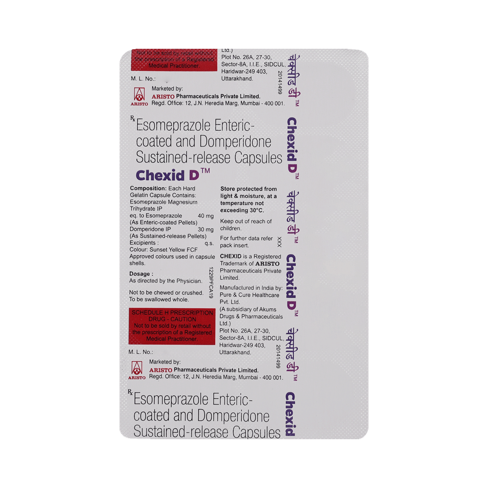 Chexid D 30mg/40mg Capsule is a combination of two medicines: Domperidone and Esomeprazole. Domperidone is a prokinetic that works on the upper digestive tract to increase the movement of the stomach and intestines, allowing the food to move more easily through the stomach. Esomeprazole is a proton pump inhibitor (PPI) that works by reducing the amount of acid in the stomach, which helps in the relief of acid-related indigestion and heartburn.