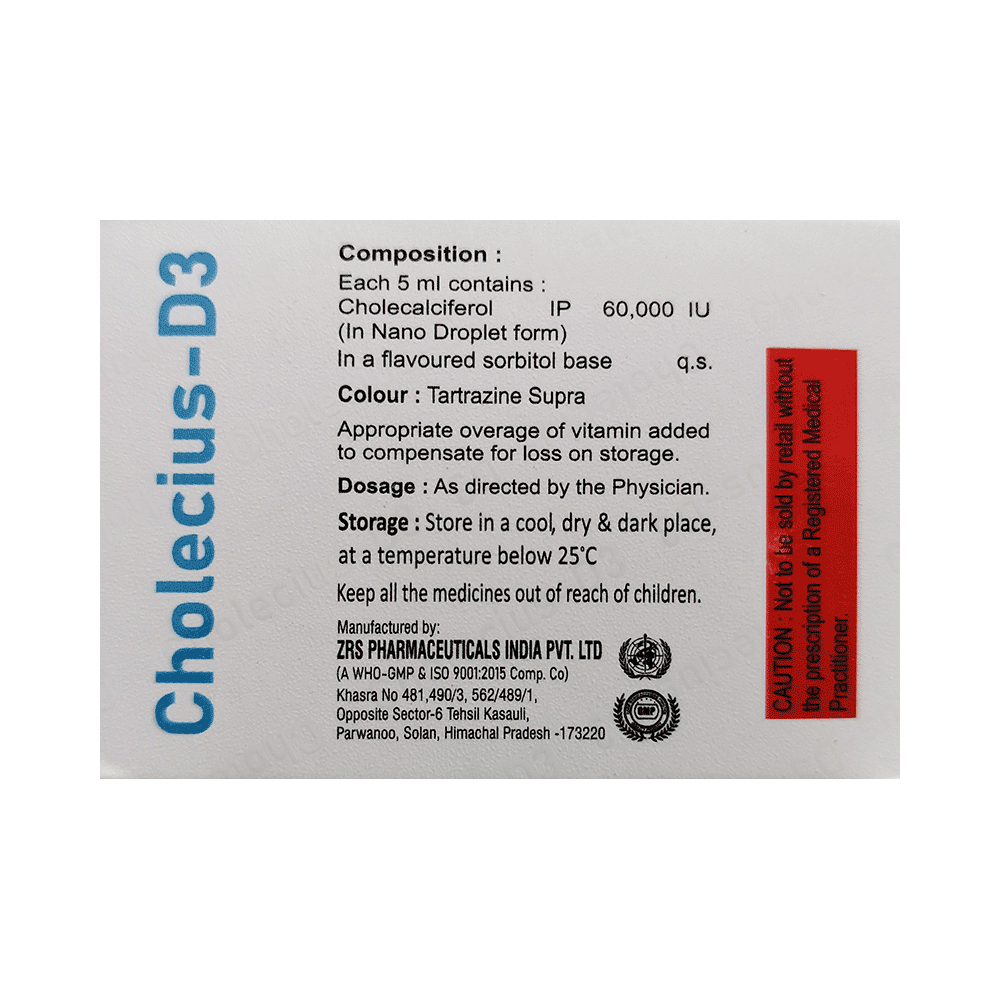 Cholecius-D3 Nano Shot (5ml Each) Sugar Free is used in the treatment of vitamin D deficiency and osteoporosis. It helps the body to absorb calcium. Calcium is essential for maintaining strong and healthy bones. It is used when your diet does not provide enough calcium. Cholecius-D3 Nano Shot (5ml Each) Sugar Free should be taken as directed by your doctor. It is best taken with or after food, as this helps your body absorb it, and you should take it regularly to get the most benefits. If you are using it to treat osteoporosis, you will also be prescribed other medicines. This medicine may be only part of a complete treatment program that includes making changes to your diet and taking calcium and vitamin supplements. Learn about the foods you should eat to ensure you get enough calcium and vitamin D.Cholecius-D3 Nano Shot (5ml Each) Sugar Free has few side effects, and none are common. If you take too much, you may feel weakness, muscle pain, or a metallic taste in your mouth. If you experience any such side effects, speak with your doctor. They may be able to help you reduce or treat the symptoms.Before taking this medicine, tell your doctor if you have high calcium levels in your blood or if you have any heart, kidney, or liver disease. Some other medicines can decrease the absorption of vitamin D3, so let your doctor know about all the other medicines you are taking to make sure you are safe. This medicine may help during pregnancy when your body needs more vitamin D, but too much could harm your baby. Discuss it with your doctor.