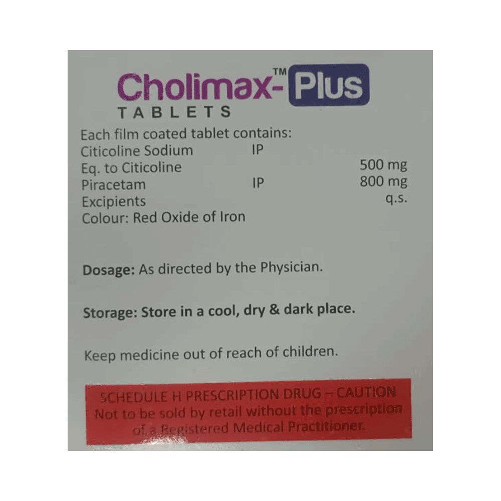 Cholimax-Plus Tablet is a medicine used in stroke rehabilitation and as a cognitive enhancer. It protects the nerve cells in the brain from damage and also helps to repair the damaged nerve cells. It may also be used in the treatment of brain trauma. Cholimax-Plus Tablet may be taken with or without food, preferably at the same time each day. Take it at the same time each day as this helps to maintain a consistent level of medicine in the body. Take this medicine in the dose and duration as advised by your doctor and if you have missed a dose, take it as soon as you remember it. Do not skip any doses and finish the full course of treatment even if you feel better. It is important that this medication is not stopped suddenly without talking to your doctor as it may worsen your symptoms.Some common side effects of this medicine include hyperactivity, stomach pain, nervousness, and decreased blood pressure. However, these are temporary and usually resolve on their own. Please consult your doctor if these do not subside or bother you. Drink plenty of fluids to keep yourself hydrated while taking this medicine as this medicine may cause diarrhea. This medicine may cause weight gain and to control it, you should have a balanced diet and exercise regularly.
