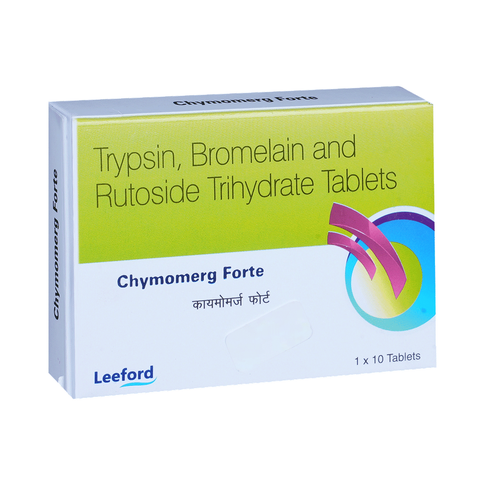 chymoMERG Forte Tablet is a combination of two enzymes (Bromelain, Trypsin) and an antioxidant (Rutoside). The enzymes work by increasing the blood supply to the affected area and helping the body produce substances that fight pain and swelling. The antioxidant protects the body from damage by chemicals (free radicals) and further reduces swelling.