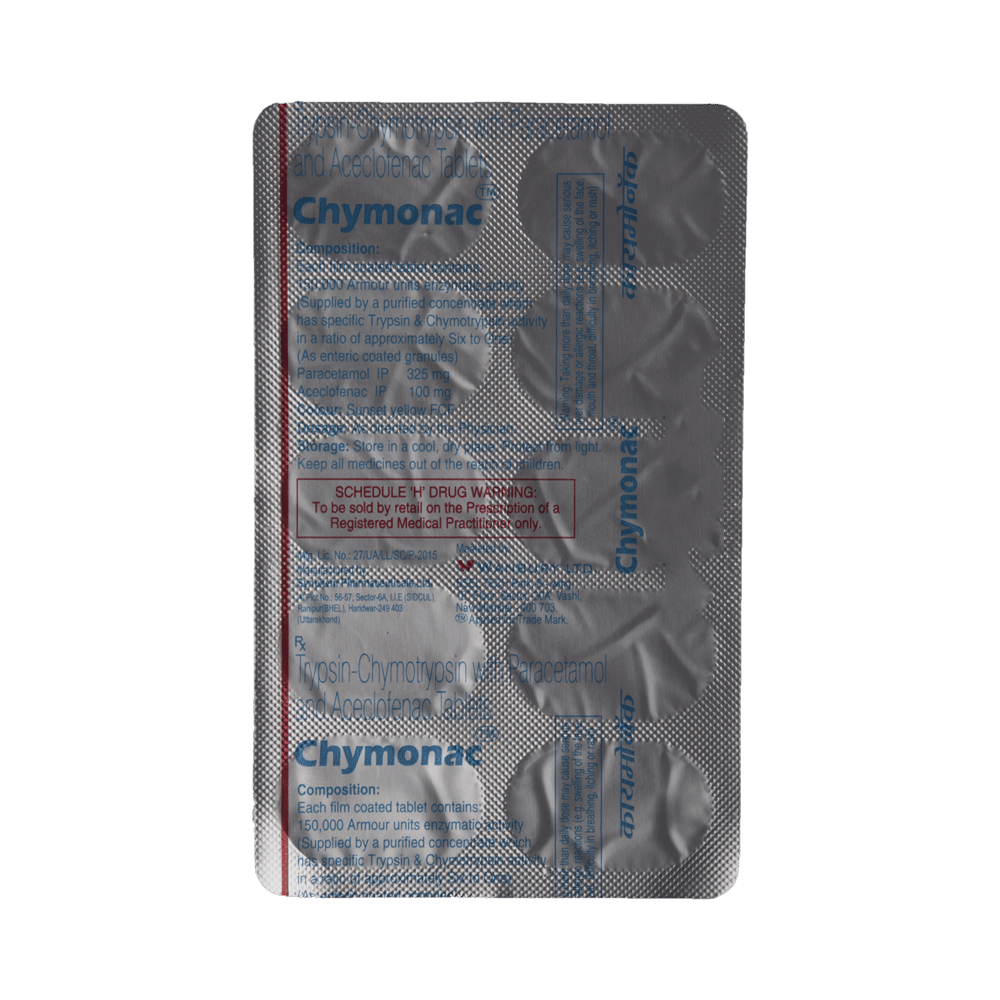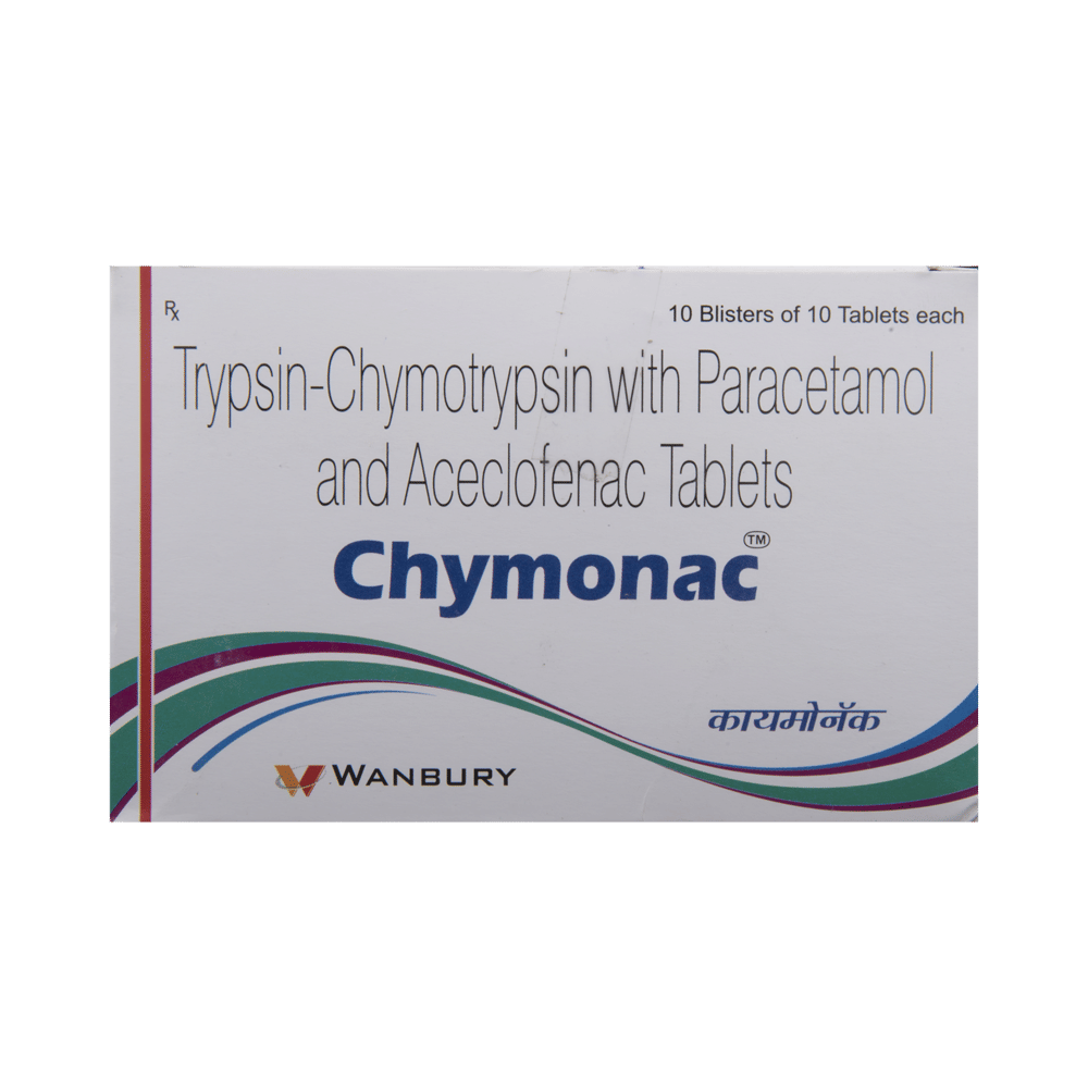 Chymonac Tablet is a pain relieving medicine. It is used to treat pain and inflammation in conditions like rheumatoid arthritis, ankylosing spondylitis, and osteoarthritis. It may also be used to relieve muscle pain, back pain, toothache, or pain in the ear and throat. Chymonac Tablet should be taken with food. This will prevent you from getting an upset stomach. The dose and duration will depend on what you are taking it for and how well it helps your symptoms. You should take it as advised by your doctor. Do not take more or use it for longer duration than recommended by the doctor.The most common side effects of this medicine include nausea, vomiting, heartburn, stomach pain, and indigestion. If any of these side effects do not resolve with time or get worse, you should let your doctor know. Your doctor may be able to suggest ways of preventing or reducing them.Before taking it, you should let your doctor know if you have a history of ulcer or bleeding in your stomach, high blood pressure, or have any problems with your heart, kidneys, or liver. Let your doctor also know about all the other medicines you are taking to make sure it is safe for you.Pregnant or breastfeeding women should consult their doctor before starting treatment. You should also avoid drinking alcohol while you are taking this medicine, as alcohol can cause excessive drowsiness.