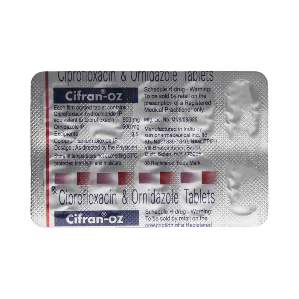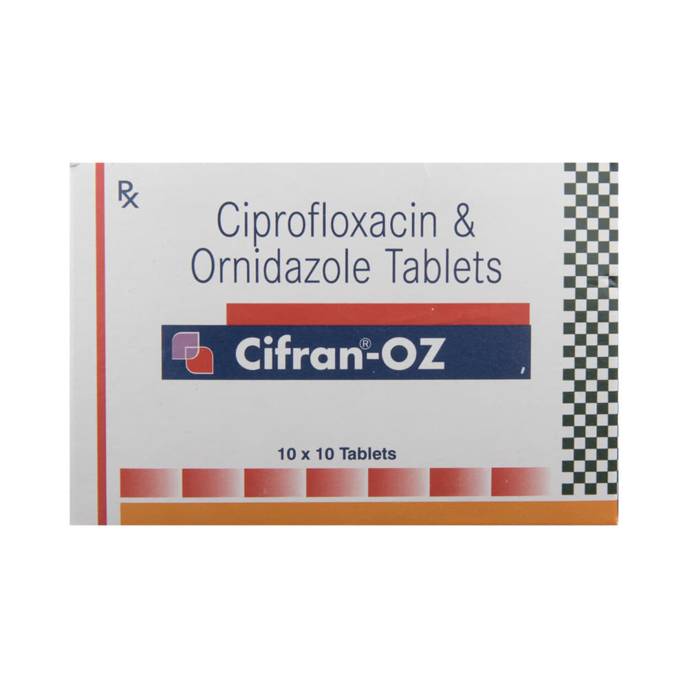 Cifran-OZ Tablet is a combination medicine that is used to treat gynecological infections, teeth and urine infections, lung infections, and abdominal infections such as acute diarrhea or dysentery. It acts against the infection-causing microorganisms to manage the infections. Cifran-OZ Tablet is a prescription medicine that is advised to be taken as suggested by the doctor. It should be taken with food, but it must be taken at a fixed time to ensure better efficacy. Do not consume more than the recommended dose, as an overdose of it may have harmful effects on your body. If you miss a dose, take it as soon as you remember. The treatment must be completed even if you feel better to ensure a complete recovery.Cifran-OZ Tablet may lead to some side effects such as nausea, vomiting, stomach pain, loss of appetite, headache, etc. To overcome any such side effects, it is advised to eat a healthy balanced diet and drink plenty of fluid. If any of the side effects get aggravated, contact your doctor immediately. If you experience any allergic reaction (rashes, itching, swelling, shortness of breath, etc.), you must consult your doctor immediately.Before taking this medicine, you should tell your doctor if you have any problems with your liver or kidneys. Also, tell your doctor if you are on any medication for any health condition. Pregnant or breastfeeding women should also consult with the doctors before taking it. Avoid drinking alcohol as it can cause excessive dizziness with this medicine. It usually does not impair your ability to drive, but you should not drive if it makes you feel sleepy or dizzy. If you are a known allergic to the medicine, you must refrain from using this medicine and consult your doctor. It is advised to take proper rest during the course of treatment for the medicine to work effectively.