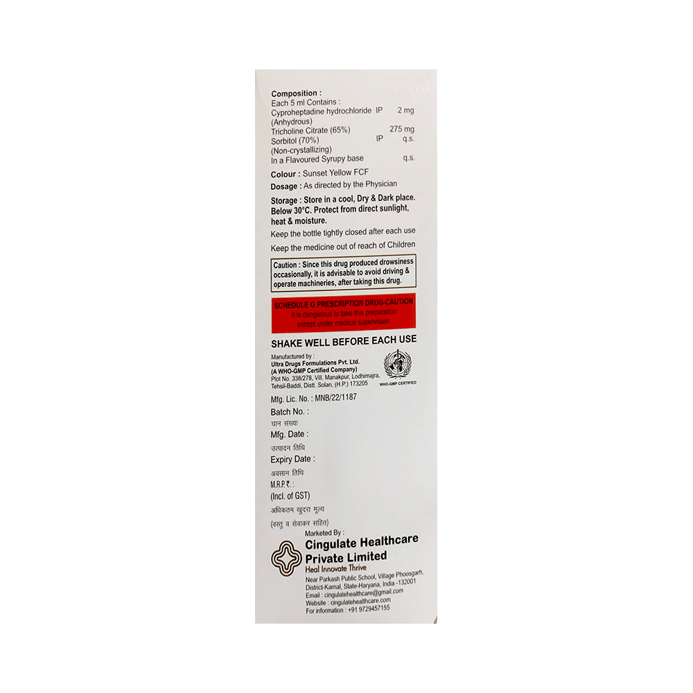 Salt Composition: Cyproheptadine (2mg/5ml) + Tricholine Citrate (275mg/5ml) + Sorbitol (70%)