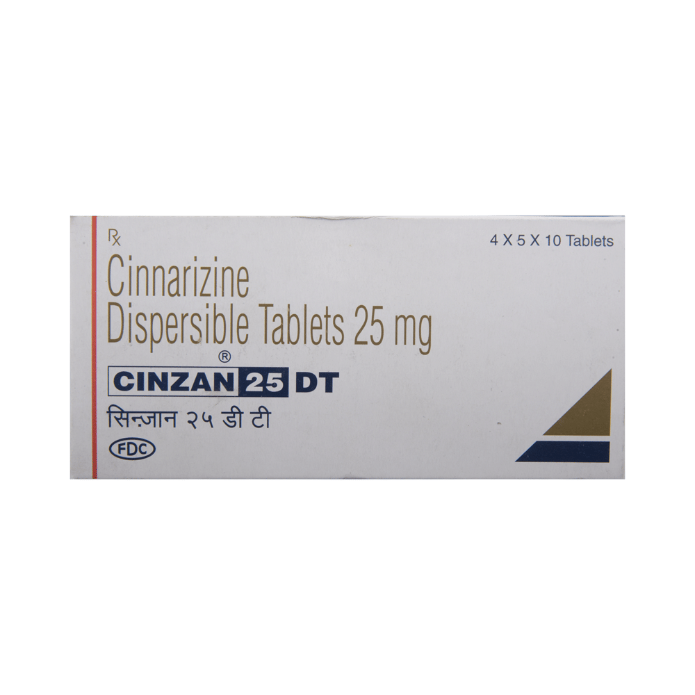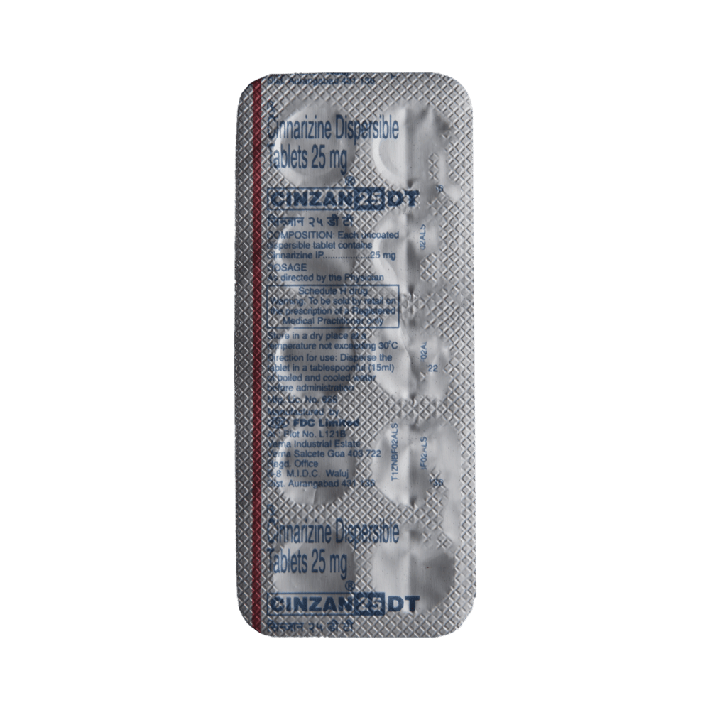 In Treatment of Motion sicknessMotion sickness is a condition caused due to motion during travel. You may experience a spinning sensation (vertigo), nausea, or vomiting as a result of this condition. Cinzan 25 DT Tablet helps treat these symptoms effectively. Take it as prescribed by the doctor to get maximum benefit.In Treatment of VertigoVertigo means a spinning sensation or dizziness that is triggered due to frequent movement. It can happen due to many reasons but it may also occur without any underlying disease. Cinzan 25 DT Tablet helps treat this sensation effectively. If you feel dizzy while getting up from the bed, sit for a while, and then rise slowly to avoid having an accidental fall.In Treatment of Meniere's diseaseCinzan 25 DT Tablet helps in improving blood flow to the inner ear which reduces the pressure of excess fluid there. It is this pressure that is thought to cause the symptoms of nausea, vertigo (dizziness), tinnitus (ringing in your ears), and hearing loss in people who have Meniere’s disease. Cinzan 25 DT Tablet makes the symptoms milder and reduces the number of times you get the symptoms. It will be more effective if you take this medicine regularly as prescribed so try not to miss doses. It may take a couple of weeks before you notice any improvements but keep taking it, even if you do feel better, until your doctor advises it is safe to stop.show moreshow less