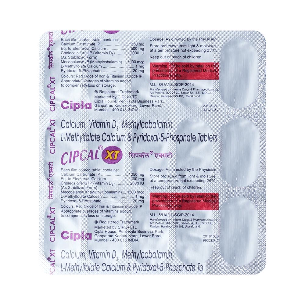 Cipcal-XT Tablet is a combination of five medicines : Calcium Carbonate, Vitamin D3, Methylcobalamin, L-Methyl Folate Calcium, and Pyridoxal-5-phosphate. Calcium carbonate is a dietary supplement used when the amount of calcium taken in the diet is not enough. Vitamin D3 is a form of vitamin D. It raises vitamin D levels in your blood. This in turn raises calcium levels in your blood by helping you absorb more calcium from food. Methylcobalamin is a form of vitamin B12 that restores its level in the body thereby helping in treating certain anemias and nerve problems. L-Methyl Folate Calcium and Pyridoxal-5-phosphate are nutritional supplements that provide essential nutrients to our body and improve overall health.
