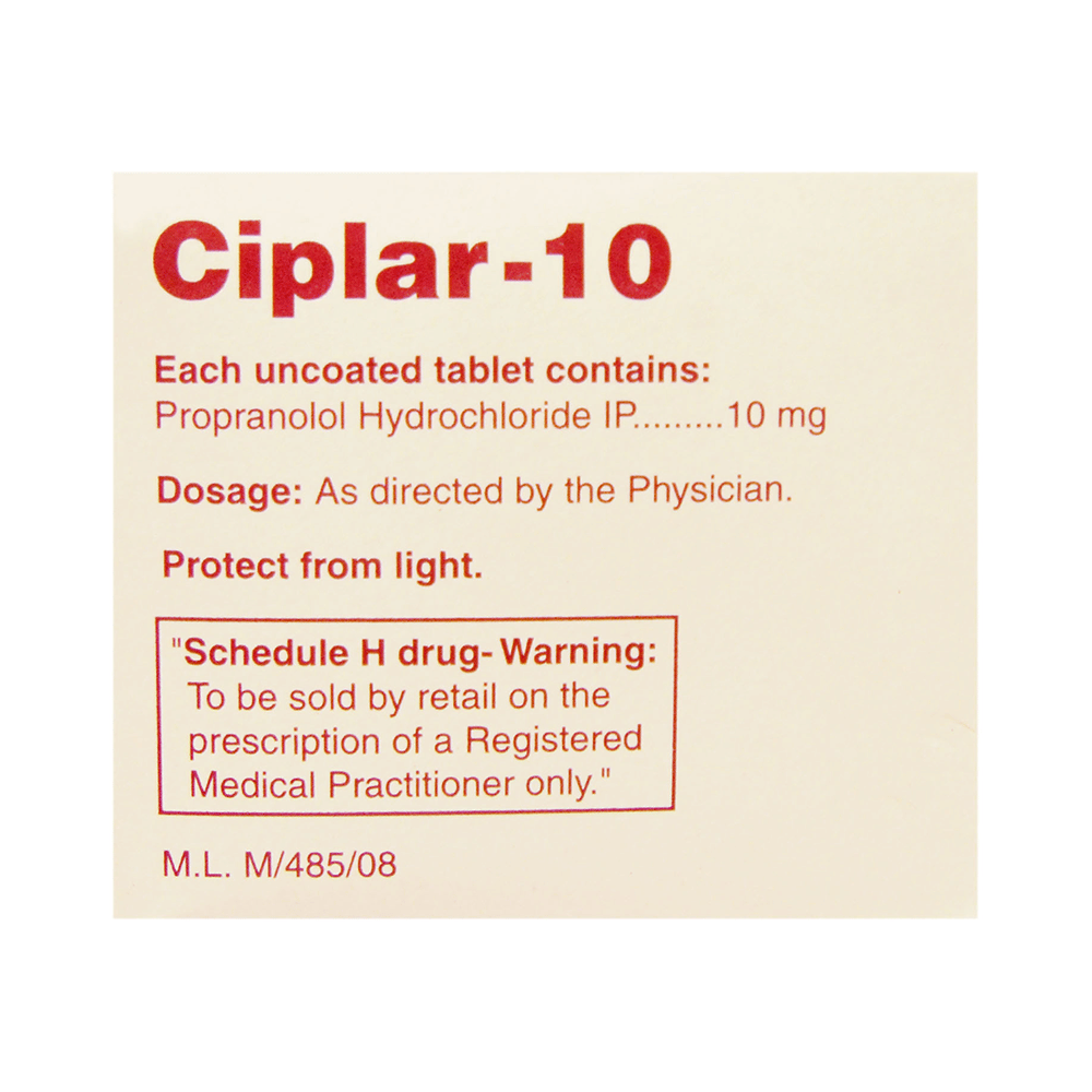 Ciplar 10 Tablet is a medicine used to prevent angina (chest pain) and migraine, and manage pheochromocytoma (a rare adrenal gland tumor). It works by slowing the heart rate and relaxing blood vessels, helping to reduce strain on the heart and improve blood flow. Take Ciplar 10 Tablet in the dose and duration prescribed by your doctor. It will depend on what you are being treated for and how you respond to the medicine. You should always take it as prescribed by the doctor. It can be taken with or without food. You should keep taking it even if you feel well, as you are still getting the benefits. If you stop taking it suddenly, your condition may worsen.The most common side effects of Ciplar 10 Tablet include tiredness, dizziness, weakness, cold fingers or toes, and stomach pain. You may also experience nausea, vomiting, and diarrhea. Talk to your doctor if the side effects bother you or do not go away. Most side effects are short-lived and improve as your body gets used to the medicine.You should not use Ciplar 10 Tablet if you have asthma, very slow or uneven heartbeats, or a serious heart condition, including heart failure. Talk to your doctor before taking it if you have kidney or liver problems or chronic obstructive pulmonary disease (COPD). In terms of lifestyle, alcohol may affect the way this medicine works and should be avoided. You should not drive if this medicine makes you feel dizzy. Ask your doctor whether it is safe to take this medicine if you are pregnant or breastfeeding.