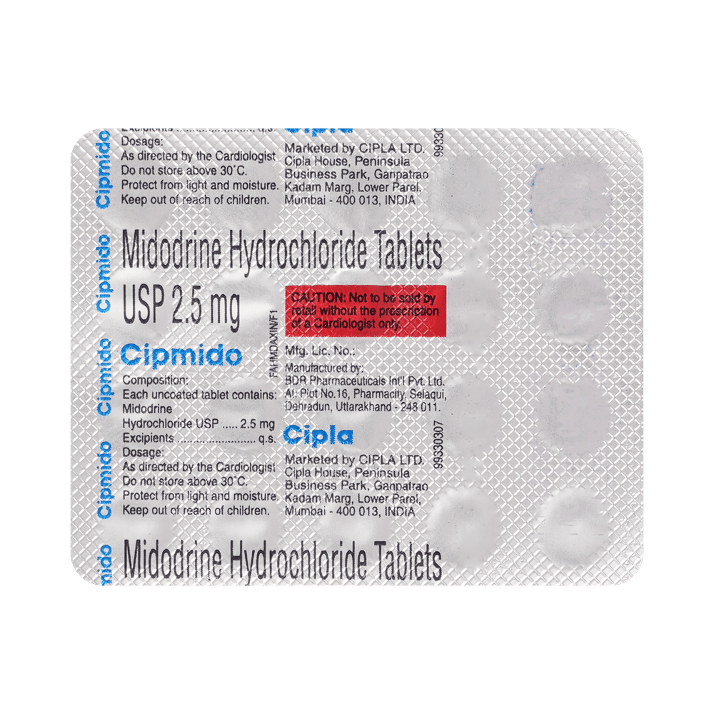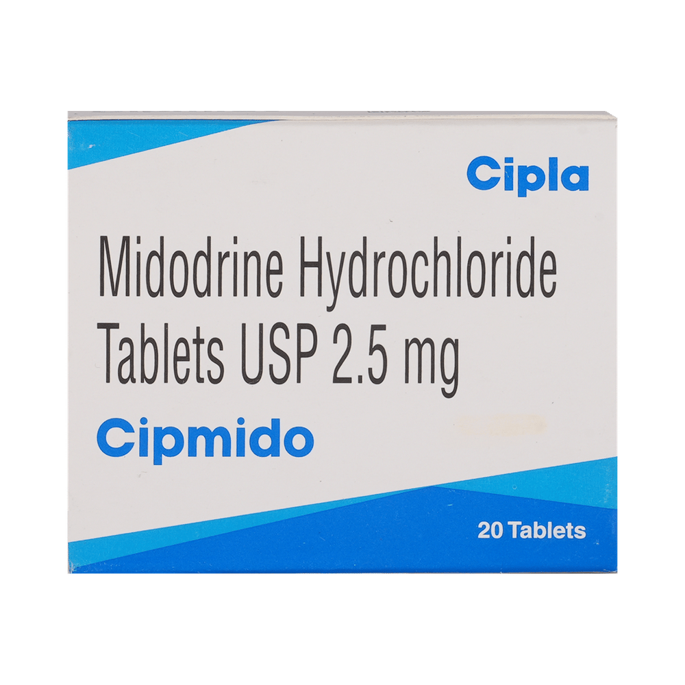 Cipmido 2.5mg Tablet is used to treat low blood pressure (hypotension). It is used in patients who experience dizziness due to low blood pressure while standing up suddenly from a sitting or lying position. This medicine causes tightening of blood vessels and results in an elevation of your blood pressure. Cipmido 2.5mg Tablet can be taken with or without food. This medicine is taken during daytime hours when people stand most often. But, it should not be taken if you are going to lie down for a long time after the dose. You should always take this medicine as advised by the doctor and should never stop it without consulting the doctor. You should monitor your blood pressure regularly while taking this medicine.Common side effects of this medicine include headache, nausea, rash, urinary retention, difficulty urination, and flushing. It may also cause supine hypertension, which is an increase in your blood pressure while lying down. Consult your doctor if these side effects bother you.Before taking this medicine, it is better to let your doctor know if you are suffering from any kidney or liver disease. Also, pregnant women and breastfeeding mothers should consult a doctor before taking it. You must inform the doctor about all the other medicines that you are taking apart from this medicine. Your doctor may ask for monitoring of kidney and liver function before and during the treatment with this medicine.