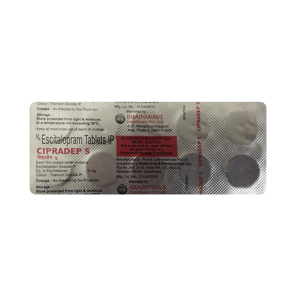 Cipradep 5 Tablet is a selective serotonin reuptake inhibitor (SSRI) antidepressant. It works by increasing the levels of serotonin, a chemical messenger in the brain. This improves mood and physical symptoms of depression and also relieves symptoms of anxiety, panic attacks and obsessive-compulsive disorders.