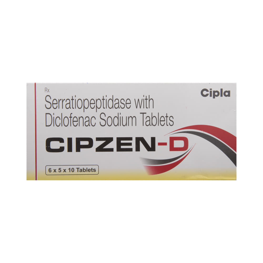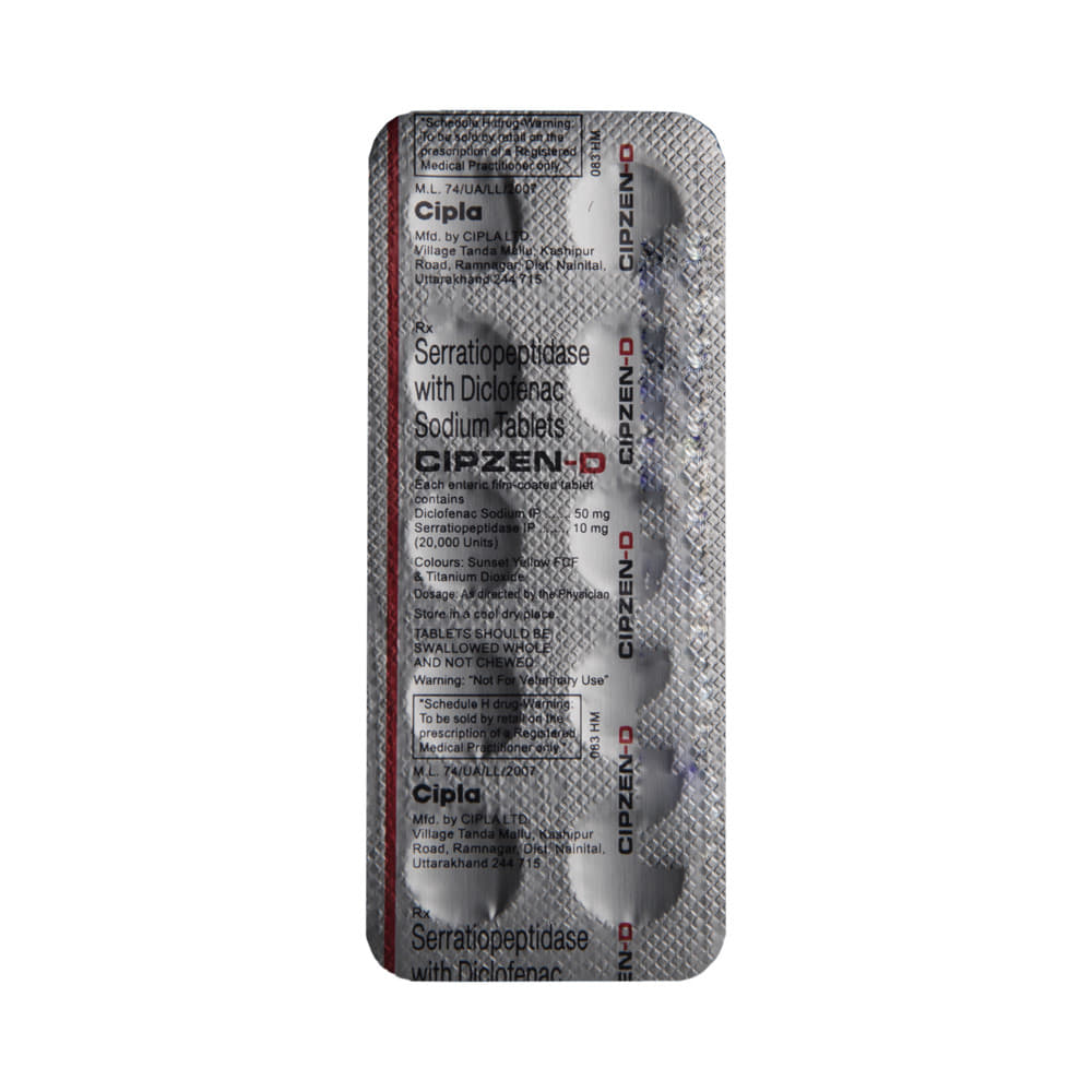 Cipzen-D Tablet is a combination of two medicines: Diclofenac and Serratiopeptidase. Diclofenac is a non-steroidal anti-inflammatory drug (NSAID) which works by blocking the release of certain chemical messengers in the brain that cause pain and inflammation (redness and swelling). Serratiopeptidase is an enzyme which works by breaking down abnormal proteins at the site of inflammation and promotes healing.