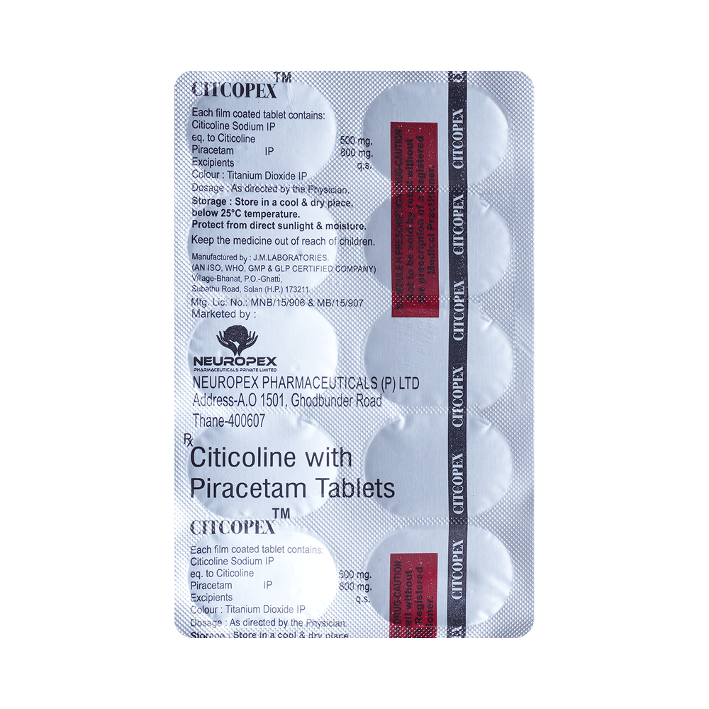 Citcopex Tablet is a combination of two medicines: Citicoline and Piracetam. Citicoline is a nerve protecting medicine. It works on the brain by nourishing the nerve cells, protects them from damage and improves their survival. Piracetam is a GABA (gamma amino butyric acid) analogue. It works by protecting the brain and nervous system against shortness of oxygen and also affects various ion channels on nerve cell membrane.