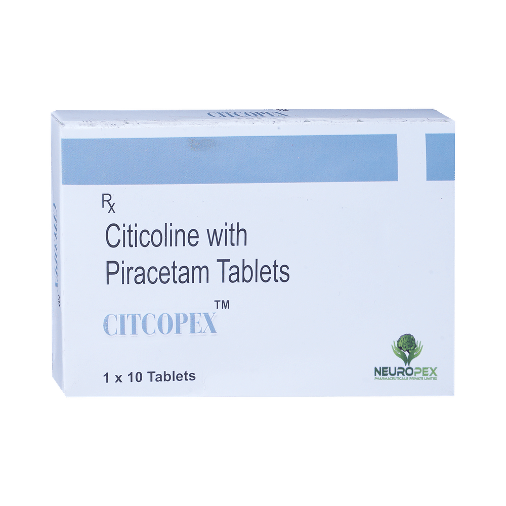 Citcopex Tablet is a medicine used in stroke rehabilitation and as a cognitive enhancer. It protects the nerve cells in the brain from damage and also helps to repair the damaged nerve cells. It may also be used in the treatment of brain trauma. Citcopex Tablet may be taken with or without food, preferably at the same time each day. Take it at the same time each day as this helps to maintain a consistent level of medicine in the body. Take this medicine in the dose and duration as advised by your doctor and if you have missed a dose, take it as soon as you remember it. Do not skip any doses and finish the full course of treatment even if you feel better. It is important that this medication is not stopped suddenly without talking to your doctor as it may worsen your symptoms.Some common side effects of this medicine include hyperactivity, stomach pain, nervousness, and decreased blood pressure. However, these are temporary and usually resolve on their own. Please consult your doctor if these do not subside or bother you. Drink plenty of fluids to keep yourself hydrated while taking this medicine as this medicine may cause diarrhea. This medicine may cause weight gain and to control it, you should have a balanced diet and exercise regularly.