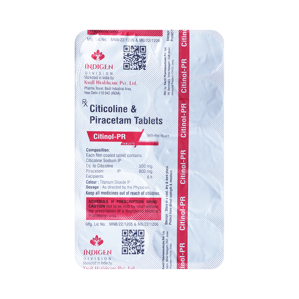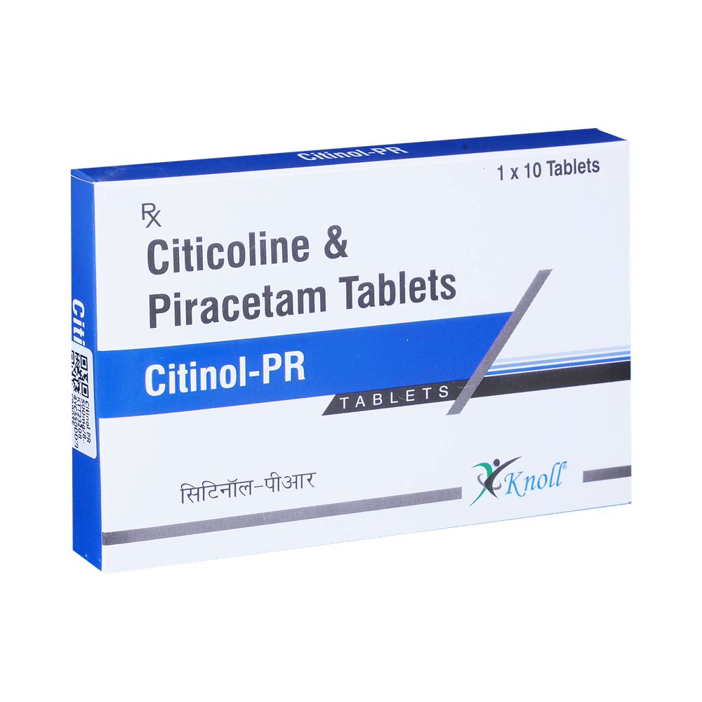 Citinol PR 500mg/800mg Tablet is a medicine used in stroke rehabilitation and as a cognitive enhancer. It protects the nerve cells in the brain from damage and also helps to repair the damaged nerve cells. It may also be used in the treatment of brain trauma. Citinol PR 500mg/800mg Tablet may be taken with or without food, preferably at the same time each day. Take it at the same time each day as this helps to maintain a consistent level of medicine in the body. Take this medicine in the dose and duration as advised by your doctor and if you have missed a dose, take it as soon as you remember it. Do not skip any doses and finish the full course of treatment even if you feel better. It is important that this medication is not stopped suddenly without talking to your doctor as it may worsen your symptoms.Some common side effects of this medicine include hyperactivity, stomach pain, nervousness, and decreased blood pressure. However, these are temporary and usually resolve on their own. Please consult your doctor if these do not subside or bother you. Drink plenty of fluids to keep yourself hydrated while taking this medicine as this medicine may cause diarrhea. This medicine may cause weight gain and to control it, you should have a balanced diet and exercise regularly.