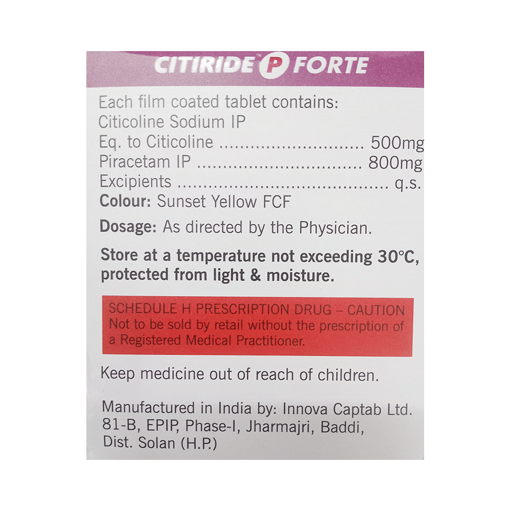 Citiride P Forte Tablet is a medicine used in stroke rehabilitation and as a cognitive enhancer. It protects the nerve cells in the brain from damage and also helps to repair the damaged nerve cells. It may also be used in the treatment of brain trauma. Citiride P Forte Tablet may be taken with or without food, preferably at the same time each day. Take it at the same time each day as this helps to maintain a consistent level of medicine in the body. Take this medicine in the dose and duration as advised by your doctor and if you have missed a dose, take it as soon as you remember it. Do not skip any doses and finish the full course of treatment even if you feel better. It is important that this medication is not stopped suddenly without talking to your doctor as it may worsen your symptoms.Some common side effects of this medicine include hyperactivity, stomach pain, nervousness, and decreased blood pressure. However, these are temporary and usually resolve on their own. Please consult your doctor if these do not subside or bother you. Drink plenty of fluids to keep yourself hydrated while taking this medicine as this medicine may cause diarrhea. This medicine may cause weight gain and to control it, you should have a balanced diet and exercise regularly.