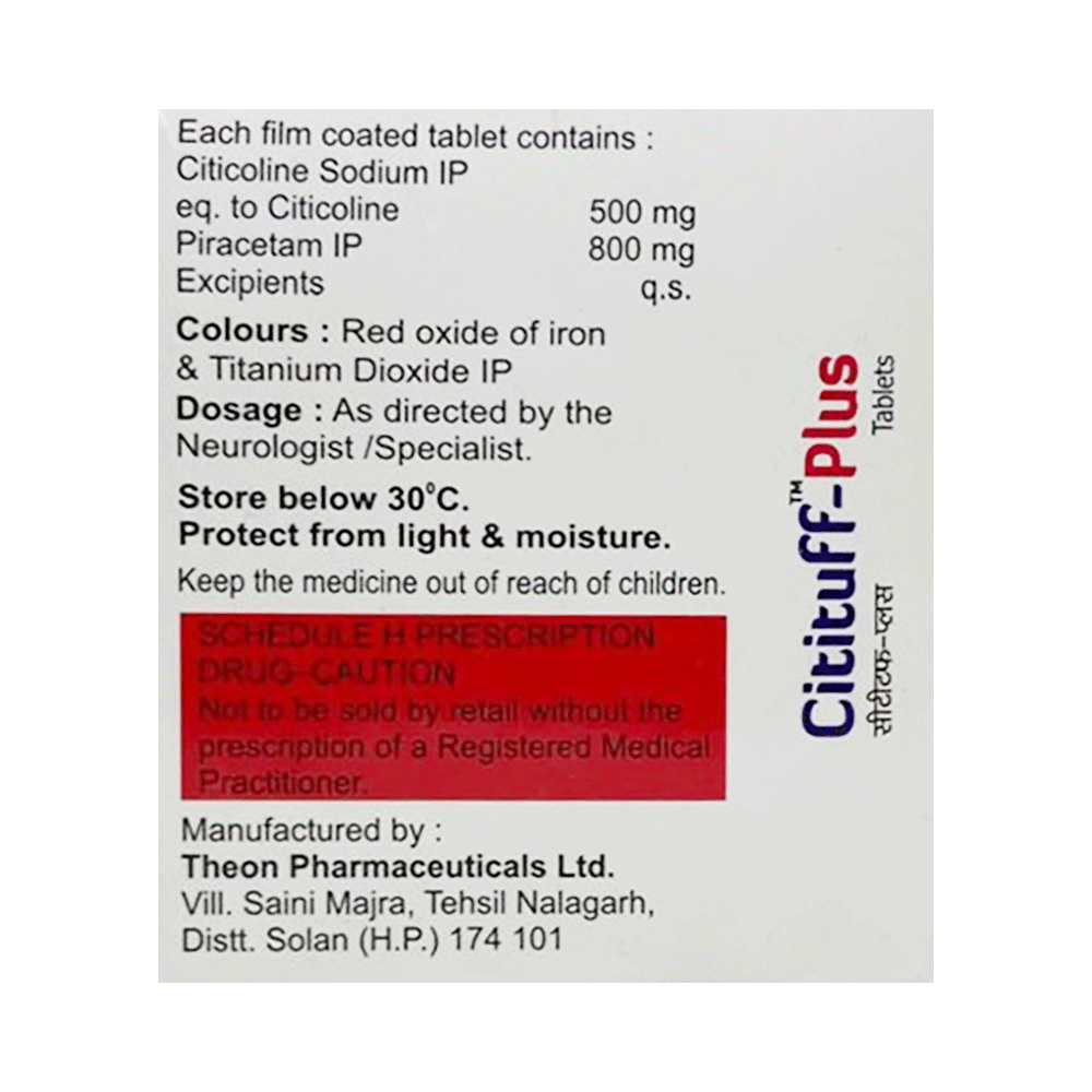 Citituff-Plus Tablet is a medicine used in stroke rehabilitation and as a cognitive enhancer. It protects the nerve cells in the brain from damage and also helps to repair the damaged nerve cells. It may also be used in the treatment of brain trauma. Citituff-Plus Tablet may be taken with or without food, preferably at the same time each day. Take it at the same time each day as this helps to maintain a consistent level of medicine in the body. Take this medicine in the dose and duration as advised by your doctor and if you have missed a dose, take it as soon as you remember it. Do not skip any doses and finish the full course of treatment even if you feel better. It is important that this medication is not stopped suddenly without talking to your doctor as it may worsen your symptoms.Some common side effects of this medicine include hyperactivity, stomach pain, nervousness, and decreased blood pressure. However, these are temporary and usually resolve on their own. Please consult your doctor if these do not subside or bother you. Drink plenty of fluids to keep yourself hydrated while taking this medicine as this medicine may cause diarrhea. This medicine may cause weight gain and to control it, you should have a balanced diet and exercise regularly.
