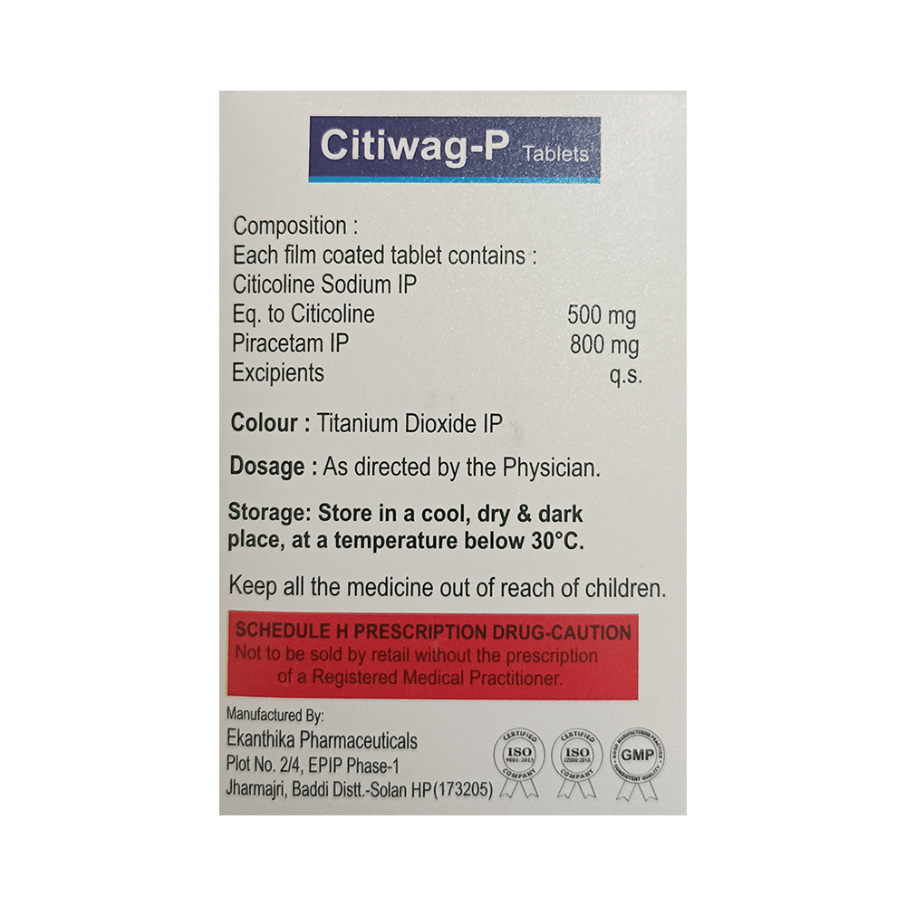 Citiwag-P Tablet is a medicine used in stroke rehabilitation and as a cognitive enhancer. It protects the nerve cells in the brain from damage and also helps to repair the damaged nerve cells. It may also be used in the treatment of brain trauma. Citiwag-P Tablet may be taken with or without food, preferably at the same time each day. Take it at the same time each day as this helps to maintain a consistent level of medicine in the body. Take this medicine in the dose and duration as advised by your doctor and if you have missed a dose, take it as soon as you remember it. Do not skip any doses and finish the full course of treatment even if you feel better. It is important that this medication is not stopped suddenly without talking to your doctor as it may worsen your symptoms.Some common side effects of this medicine include hyperactivity, stomach pain, nervousness, and decreased blood pressure. However, these are temporary and usually resolve on their own. Please consult your doctor if these do not subside or bother you. Drink plenty of fluids to keep yourself hydrated while taking this medicine as this medicine may cause diarrhea. This medicine may cause weight gain and to control it, you should have a balanced diet and exercise regularly.