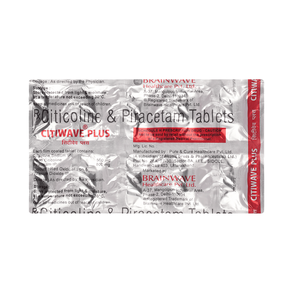 Citiwave Plus 500mg/800mg Tablet is a medicine used in stroke rehabilitation and as a cognitive enhancer. It protects the nerve cells in the brain from damage and also helps to repair the damaged nerve cells. It may also be used in the treatment of brain trauma. Citiwave Plus 500mg/800mg Tablet may be taken with or without food, preferably at the same time each day. Take it at the same time each day as this helps to maintain a consistent level of medicine in the body. Take this medicine in the dose and duration as advised by your doctor and if you have missed a dose, take it as soon as you remember it. Do not skip any doses and finish the full course of treatment even if you feel better. It is important that this medication is not stopped suddenly without talking to your doctor as it may worsen your symptoms.Some common side effects of this medicine include hyperactivity, stomach pain, nervousness, and decreased blood pressure. However, these are temporary and usually resolve on their own. Please consult your doctor if these do not subside or bother you. Drink plenty of fluids to keep yourself hydrated while taking this medicine as this medicine may cause diarrhea. This medicine may cause weight gain and to control it, you should have a balanced diet and exercise regularly.