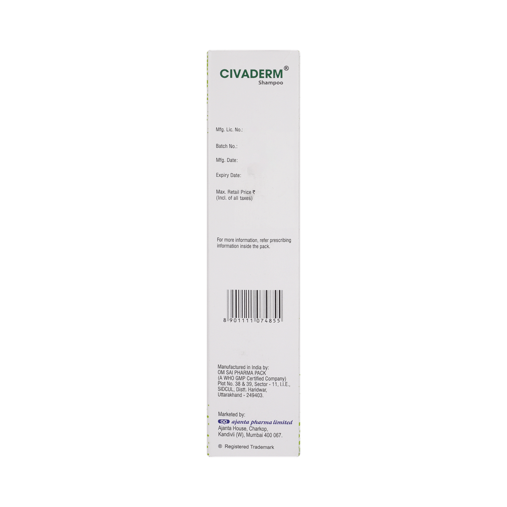 Civaderm Shampoo is an anti-dandruff medicine that is used to treat dandruff. It fights against dandruff-causing microorganisms to stop their spread and growth. It rejuvenates the skin cells and helps in getting dandruff-free hair. Civaderm Shampoo is only meant for external use and should be used as advised by your doctor. Before using it you must read the label for a proper application that will ensure a better efficacy of the medicine. If it gets into your eyes, nose, mouth, or vagina rinse it with water. Civaderm Shampoo may take several days to weeks for your symptoms to improve, but you should keep using it regularly. The course of the treatment should be completed to ensure better efficacy of the medicine. If your condition does not improve or gets worse, you should talk to your doctor.The most common side effect of this medicine includes itching, dryness, redness, and a burning sensation at the application site. These are usually self-limiting. Serious side effects are rare. You must consult the doctor if you experience any allergic reaction (rashes, itching, swelling, shortness of breath, etc.).Before using Civaderm Shampoo, it is important to tell your doctor if you are taking or have recently taken any other medicines for the same disease or other diseases. Pregnant and breastfeeding women should take this medicine with proper consultation and caution.